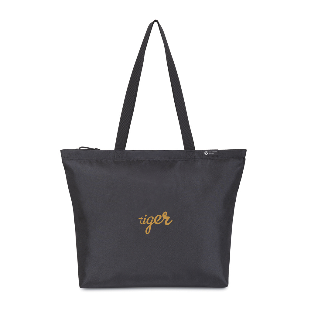 A modern and sustainable update to a classic tote bag using recycled fabric and webbing made from plastic bottles. Zippered opening to large main compartment. Interior sleeve for storing your hydration bottle. Includes AWARE™ Virtual ID & Product passport, which delivers an indisputable way to track and validate textile composition impact from origin to consumer. To access, scan the QR code located inside the product or visit wearaware.co to learn more. Available across both sides of the Atlantic. This item is also offered by Gemline for customers in the US and Canada.