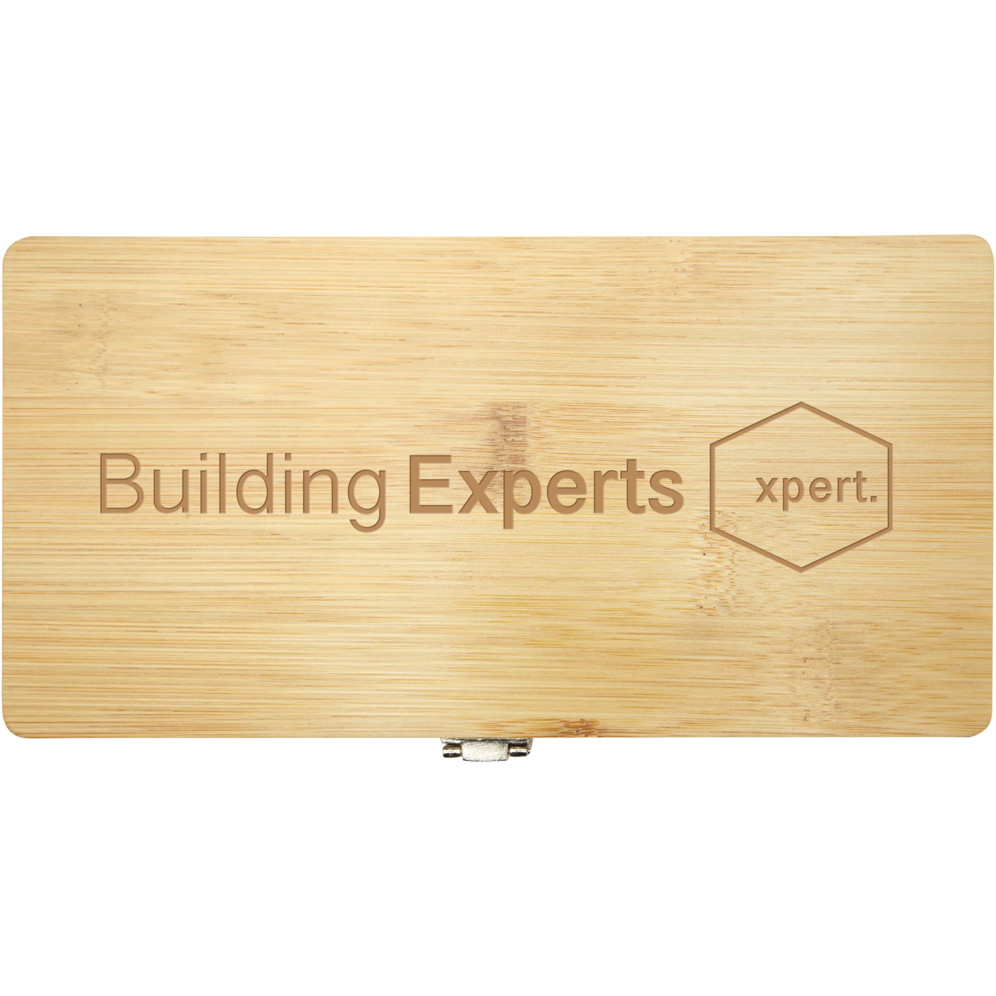 Experience the perfect blend of sustainability and functionality with the Rivet tool set. This meticulously designed toolbox is not only visually appealing, but also environmentally responsible without compromising on quality or performance. The bamboo's natural strength and durability ensure that your tools are protected for years to come. Inside the case, you'll find a set of 19 essential tools crafted from carbon steel and recycled plastic: 1 long joint handle, 4 high-quality sockets for various applications, 1 extension bar for hard-to-reach areas, 10 precision engineered screwdriver bits for any task, and 3 hex keys for furniture assembly. Whether you're a DIY enthusiast or a professional tradesperson, these tools are designed to perform reliably and withstand rigorous use. Since bamboo is a natural product, there may be slight variations in colour and size per item, which may affect the final printing outcome. Packed in a STAC gift box from sustainable sources.