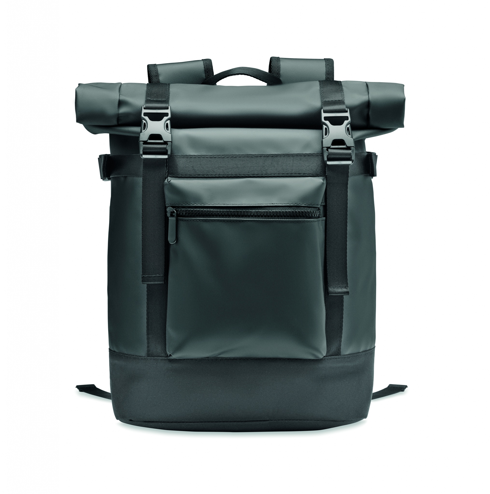 Rolltop backpack in 50C tarpaulin with padded back, base and shoulder straps reinforcement. Front zippered pockets.