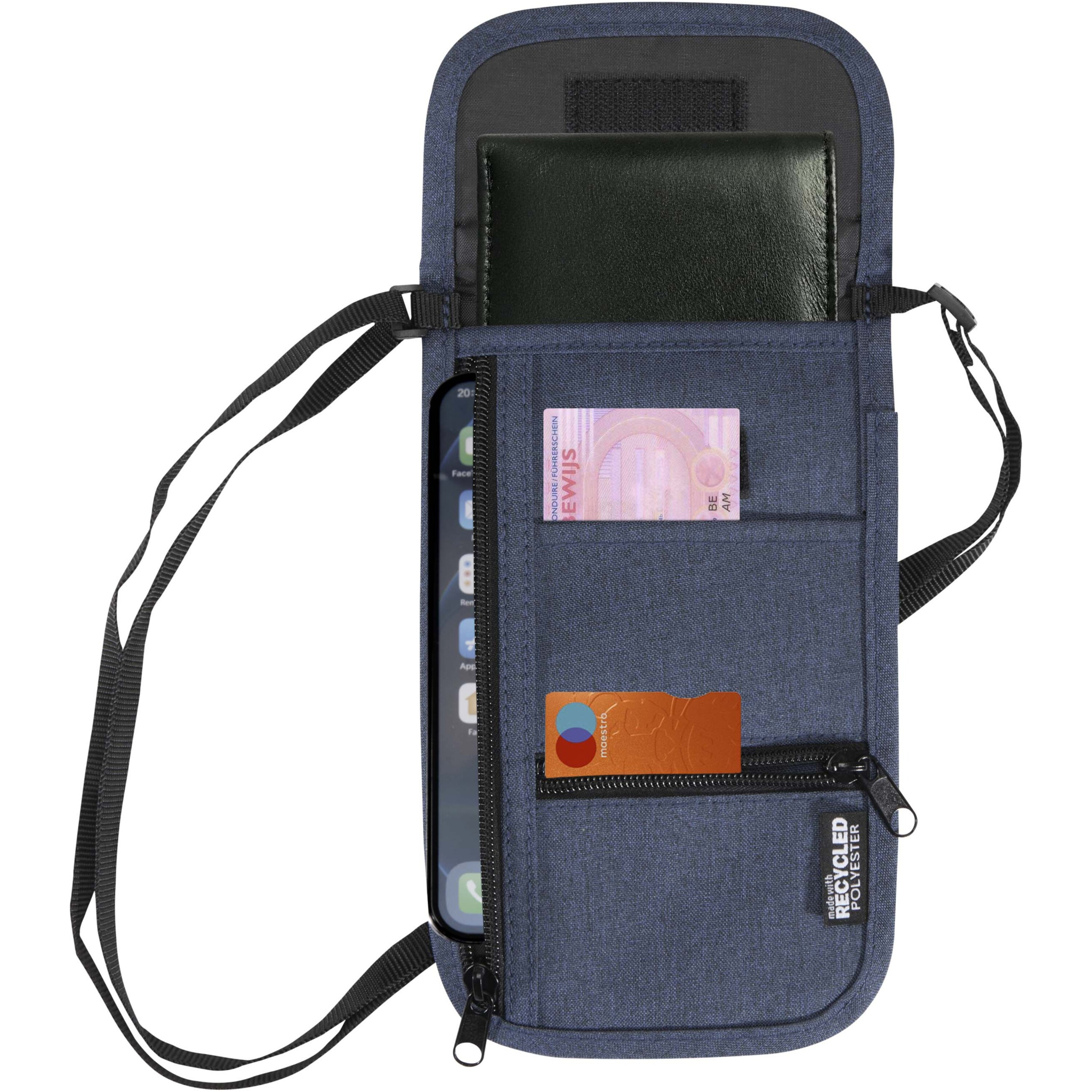 The Ross smart travel pouch is made from GRS certified recycled materials and designed to keep essentials secure and accessible on the go. Compact and practical, it features multiple pockets for a phone, power bank, passport, cards, coins, cables, and more. An adjustable strap of up to 130 cm allows comfortable carrying, making it the ideal travel accessory for modern explorers.