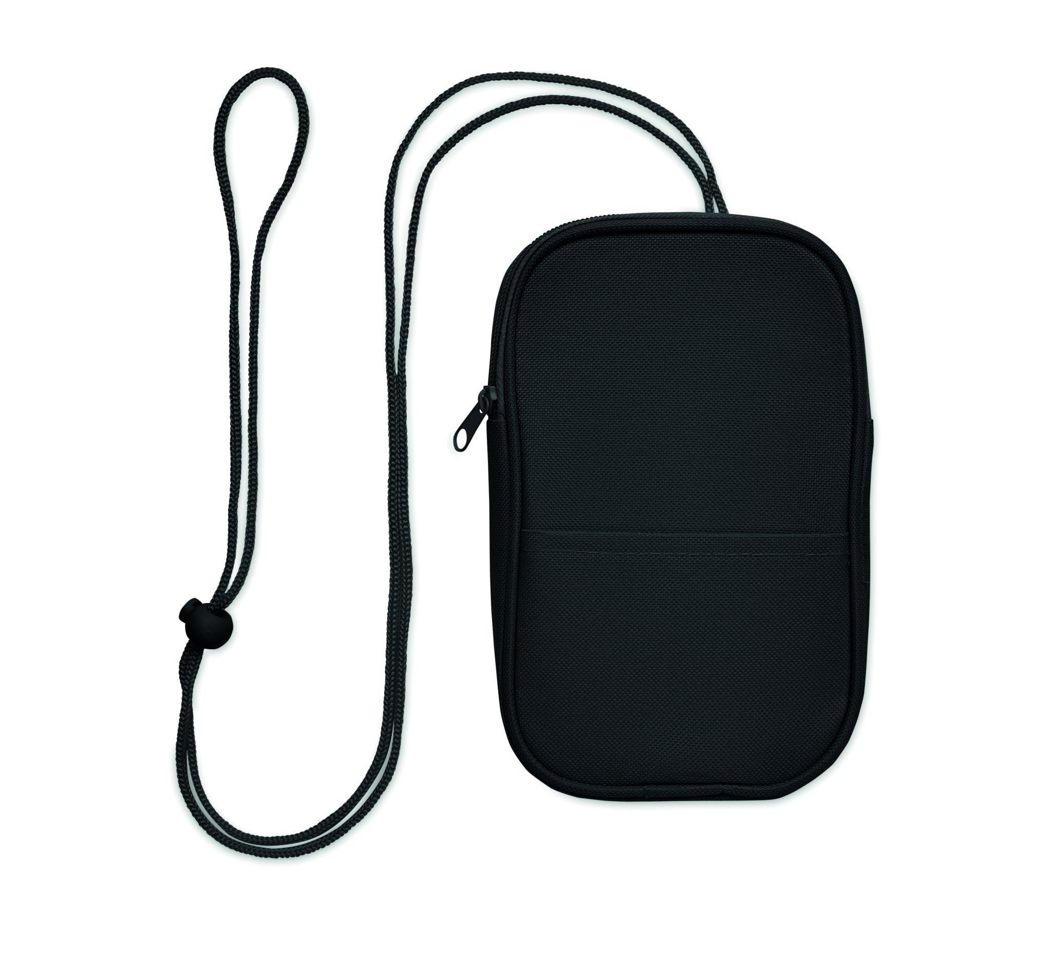 Cross body travel pouch in 600D RPET polyester and 210D RPET lining with cord strap.