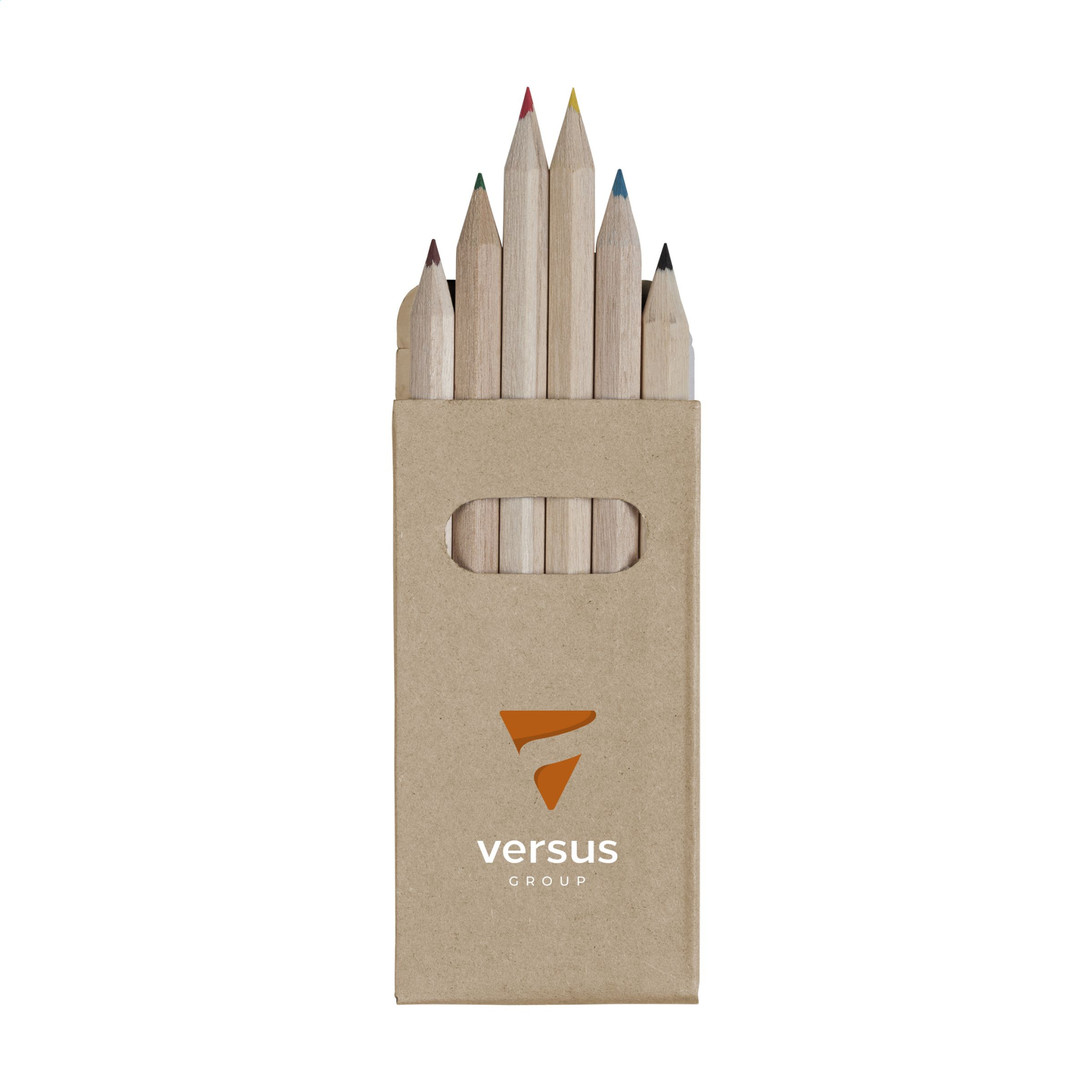 6 wooden, unpainted coloured pencils in a recycled cardboard box.