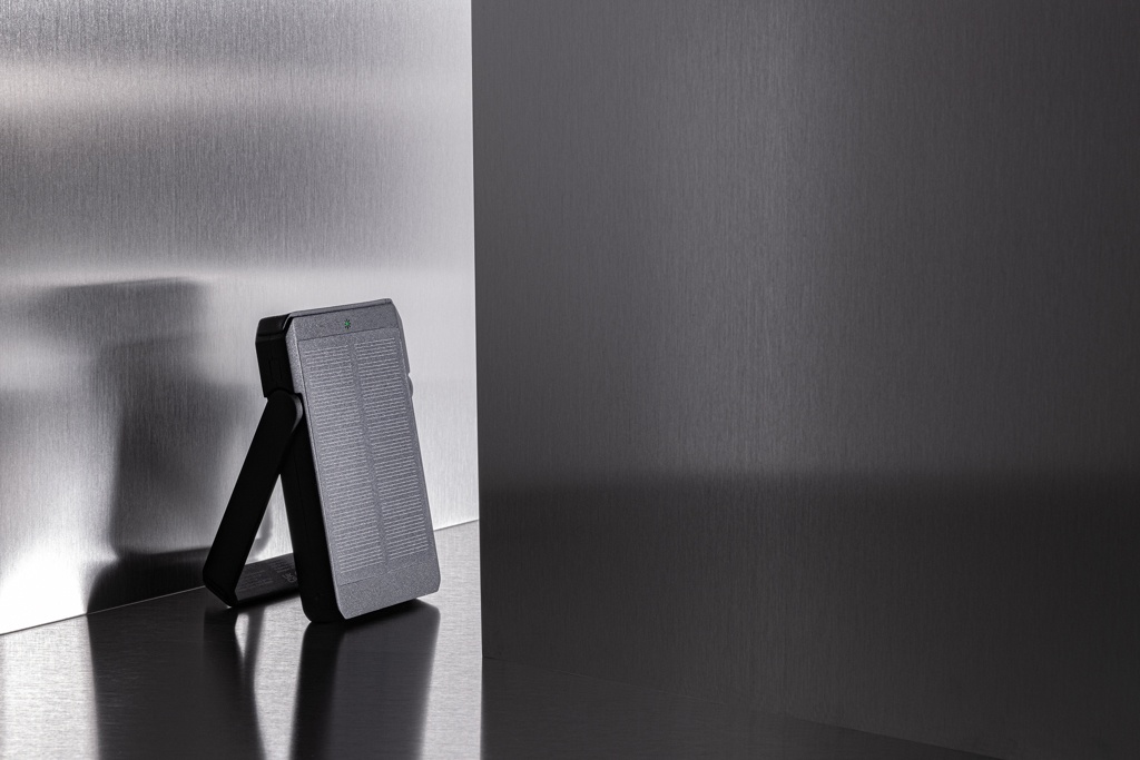 5.000 mAh solar powerbank made with RCS certified recycled ABS. Total recycled content: 21% based on total item weight. RCS certification ensures a completely certified supply chain of the recycled materials. The powerbank uses high quality monocrystalline solar panels with 19% conversion rate. Charge rate depends on conditions. With integrated stand function to use the solar panels at an optimal angle. The powerbank contains a long lasting grade A 5.000 mAh lithium battery. With 10W wireless magnetic charger to charge your phone without cables. Charging speed solar: 5V/130mA. Input type C: 5V/2A. Output: USB A: 5V/2A Type C: 5V/2A. Item and accessories PVC free. Including RCS certified recycled TPE charging cable. Packed in FSC® mix packaging. Registered design®