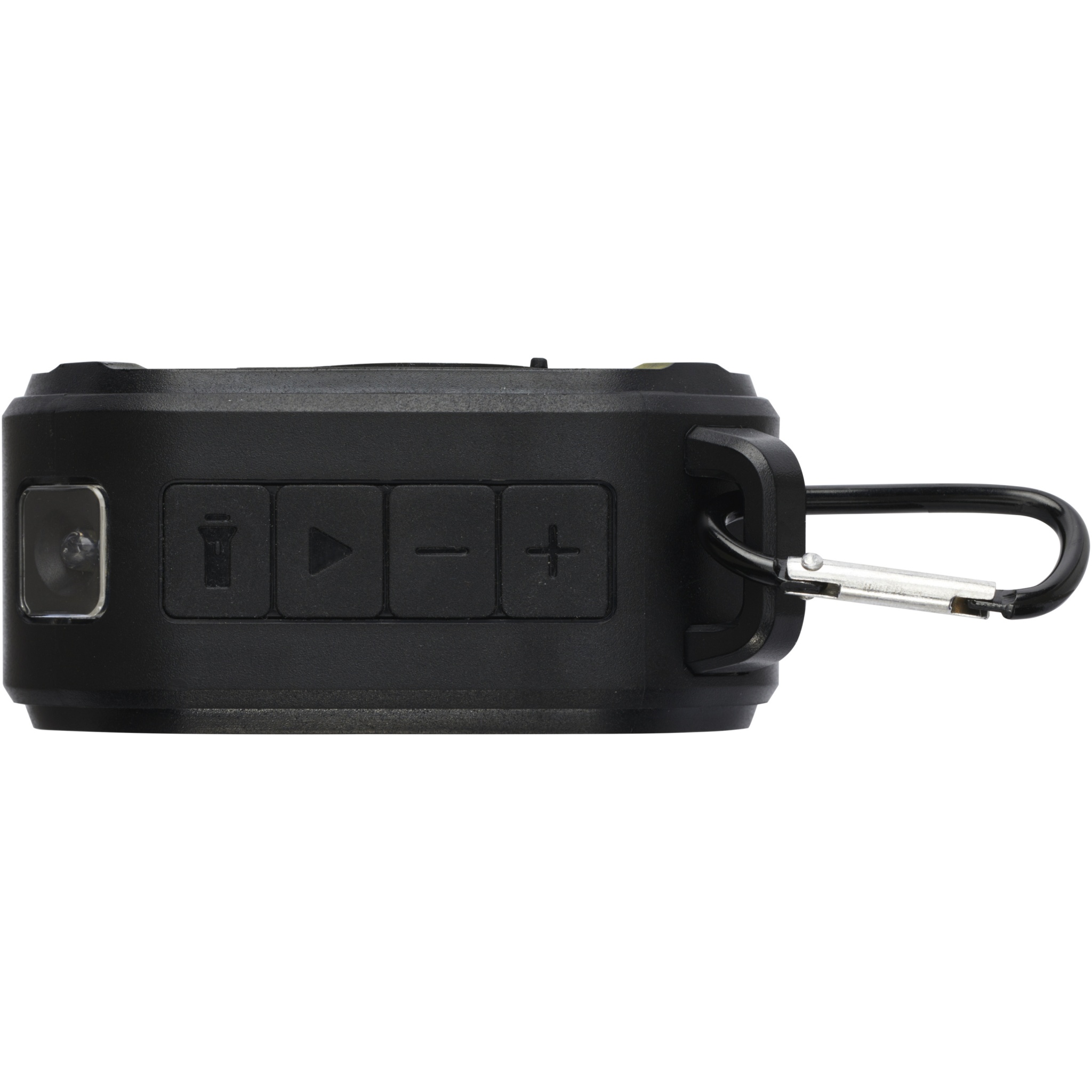 Boost your music with this RCS recycled rugged solar 3W Bluetooth® speaker with flashlight! It plays music, podcasts etc. from any Bluetooth® enabled device which makes it an ideal travel companion. The speaker features built-in music controls and a microphone for phone calls while on the go, as well as a handy flashlight. With the included carabiner it can easily be attached to for example a backpack, and with the IPX5 rating the speaker is protected against heavy rain. Thanks to its 400 mAh Li-ion battery, you can enjoy up to 3-4 hours of music at maximum volume. The charging time is 2 hours by cable, and approximately 6 hours by solar panel (depending on the sunlight brightness/consistency). The flashlight performance time is 10 hours when speaker function is off. Bluetooth® 5.3 with a working range of approximately 10 metres. Delivered with a user manual and a 30 cm USB-A to Type-C charging cable, and packed in a 100% recycled kraft paper box.