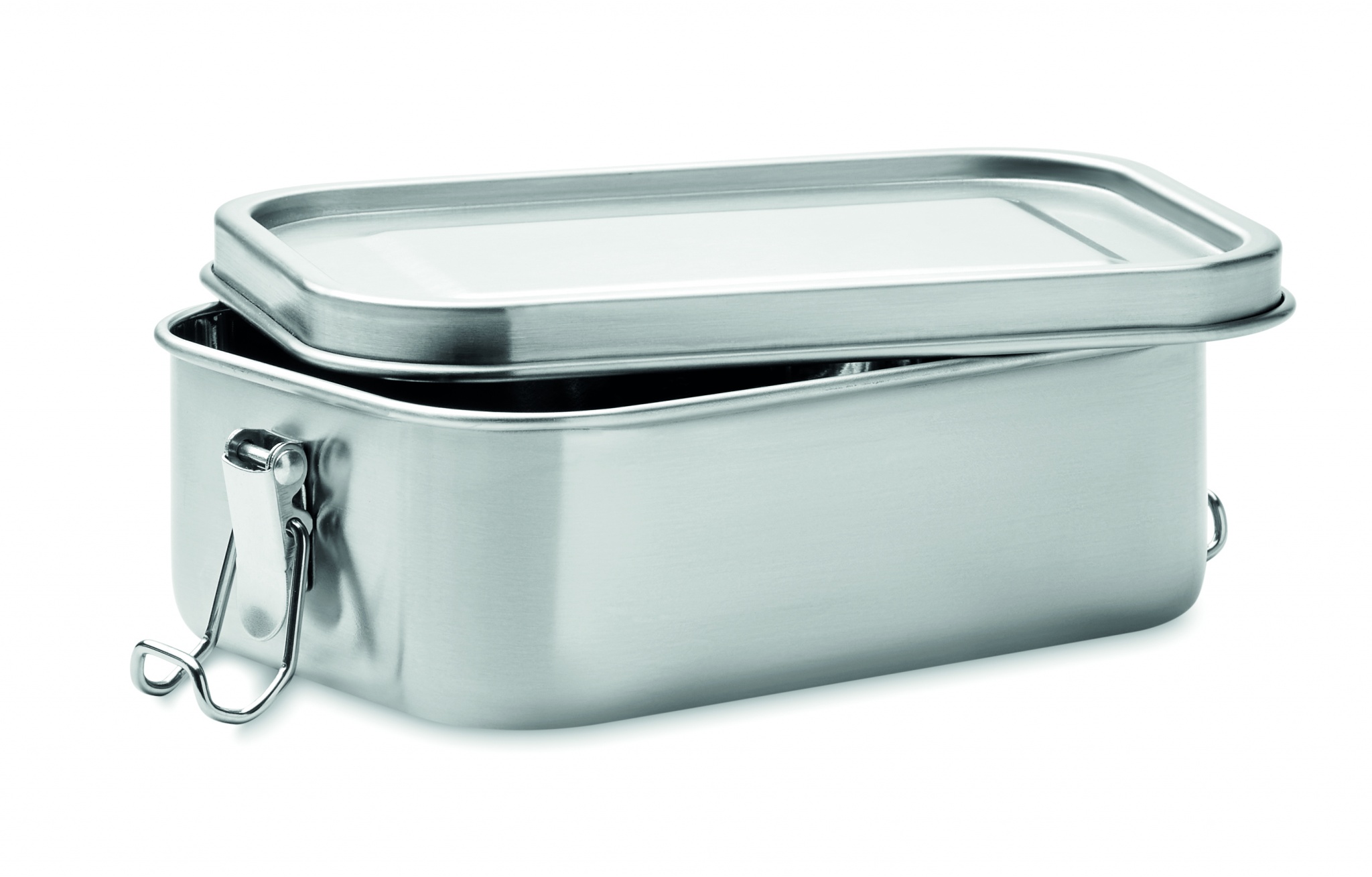 Stainless steel lunch box with strong and secure side buckles. Capacity 750 ml.