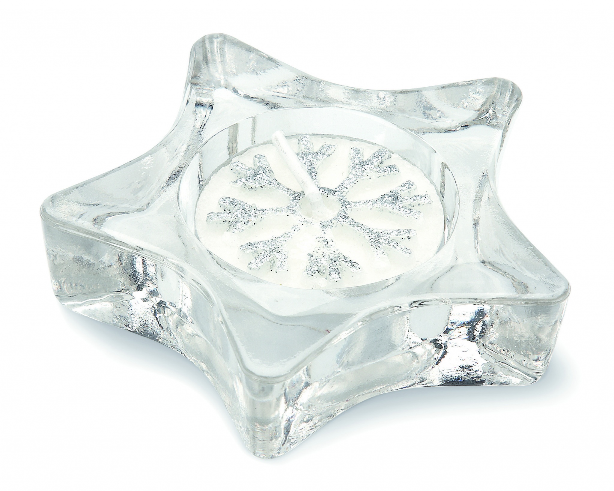 Star shaped glass tea light candle holder in silver box with transparent cover and decorative ribbon. Tea light included.
