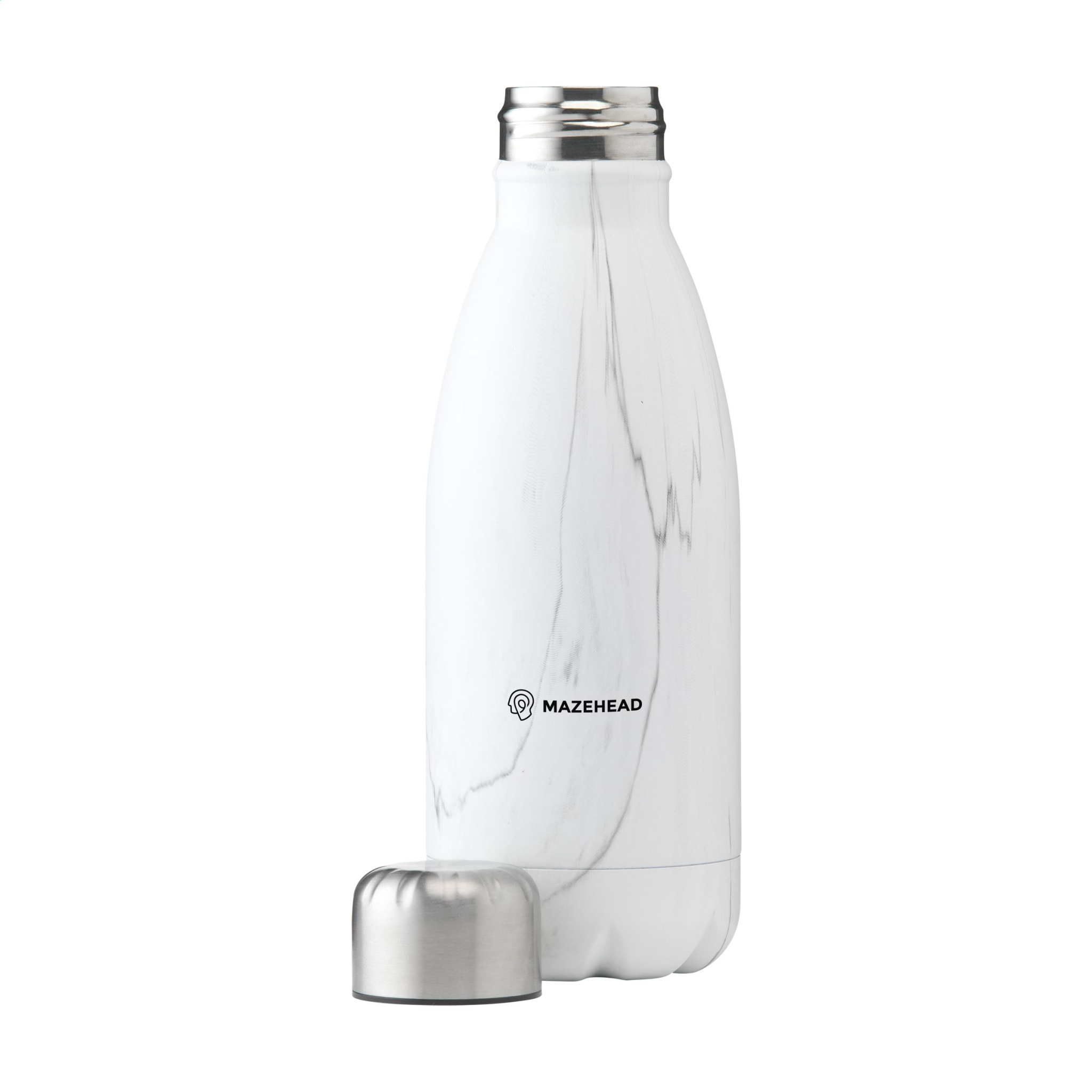 Double-walled, vaccum-insulated, stainless steel water bottle/thermo bottle. With leak proof screw cap. This elegant model has a striking, attractive top layer. Suitable for maintaining the temperature of cold or hot water. Capacity 350 ml. Each item is individually boxed.