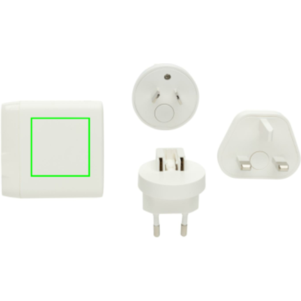 Charge anywhere you go with the Travelcharge Pro. It comes equipped with 2 USB C port and 2 USB A port to charge any mobile device you take on your travels. With integrated plug for US and additional EU, UK and AUS plug to charge in more than 100 countries worldwide. Max output: 5V/3A. Input: AC100-240V. The adapter comes in convenient travel pouch to take it to any destination. The charger is made with recycled ABS. Total recycled content: 57% based on total item weight. RCS certification ensures a completely certified supply chain of the recycled materials. PVC free. Packed in FSC® mix packaging.