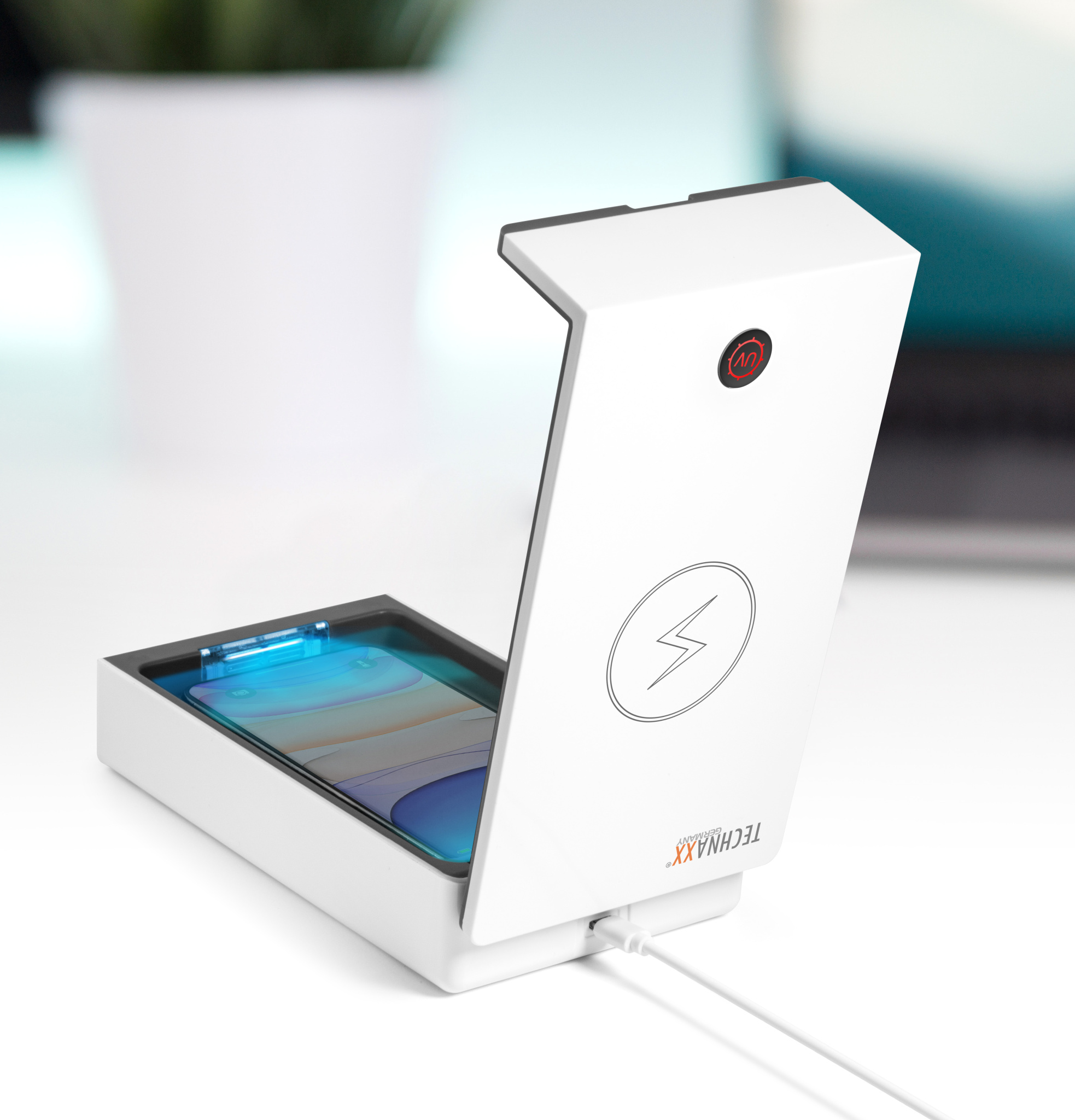 UV disinfector with wireless and wired charging. the device will remove up to 99.99% of viruses and bacteria thanks to the built-in UV-C lampThe device can also be used to disinfect other everyday objects, i.e. - smartwatches - headphones - credit cards - banknotesThe device has 2 built-in UV-C lamps. We put a smartphone or other object inside, close it and disinfect the smartphone - this process takes up to 10 minutes. Inside the chamber there is also a USB-A socket, to which you can connect a smartphone for charging, however, due to the cable protruding from the smartphone, only smaller models can be charged in this way with the lid closed. The induction charger is built into the device cover. In addition, the device has a container for aromatic oilAdditional information: Input Voltage: DC 5V / 2A USB port: 5V / 1A Wireless charging: 5W UV-C light wavelength: 253.7nm Material: ABS Weight / Dimensions: 330g / (D) 197 x (SZ) 110 x (W) 46mmIncludes USB charger cable