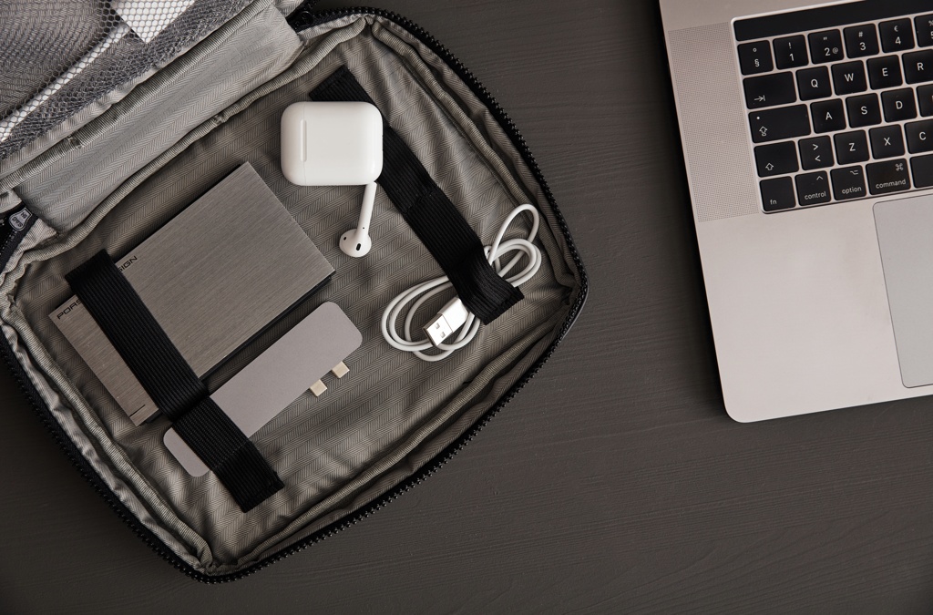 Keep all essentials near at hand with this handy organiser. This gives you a space for everything you need during a day, such as headphones, power bank, pens and notebooks. The snap hook on the short side allows you to attach the bag to a larger bag.
