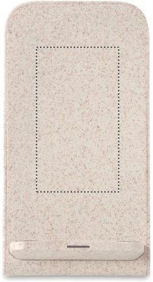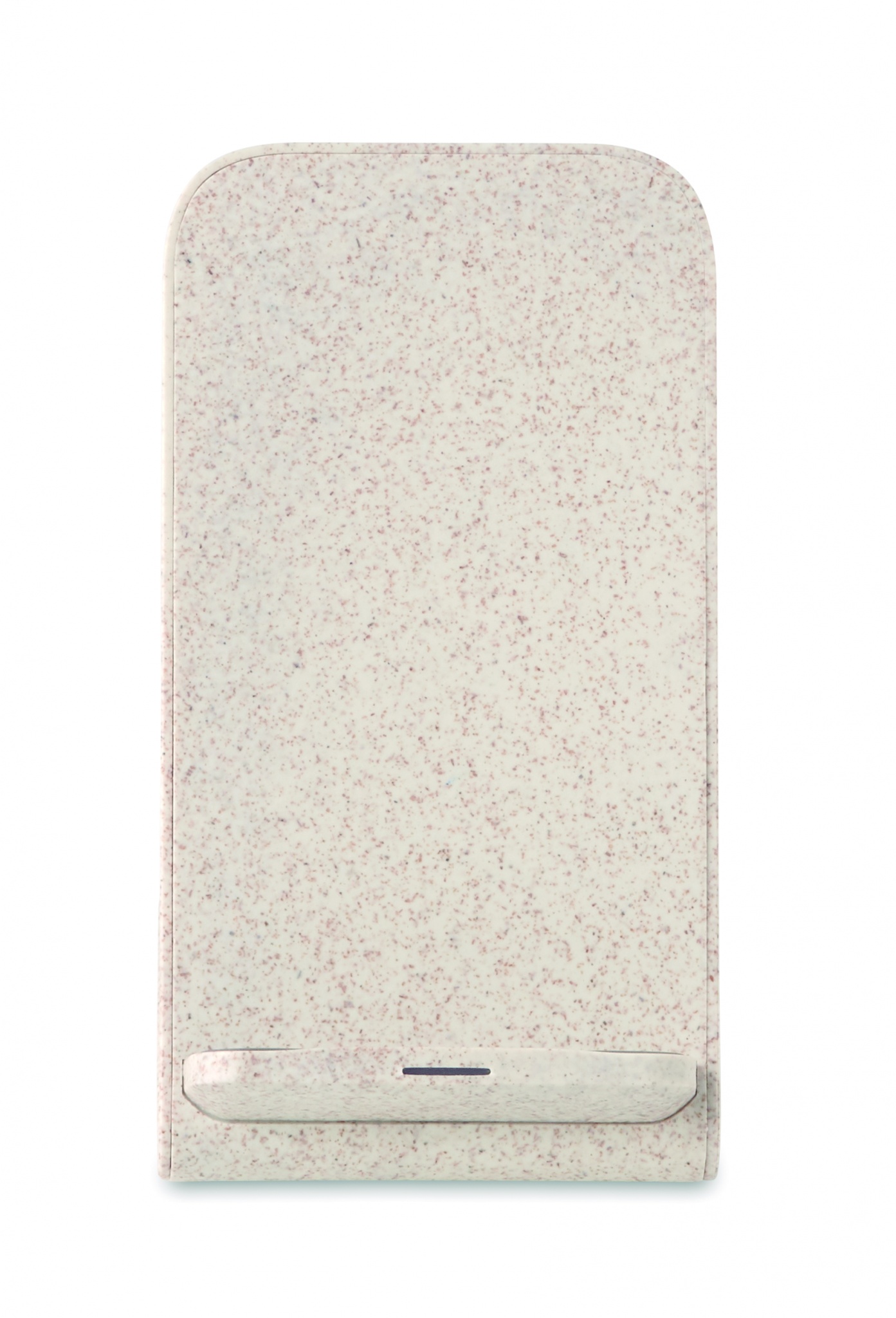 Double coil wireless charger stand. 35% wheat straw and 65% ABS. Place smartphone on it to begin charging. Output: DC5V/2A (10W) for quick charging. Compatible with latest Androids, iPhone® 8, X and newer.