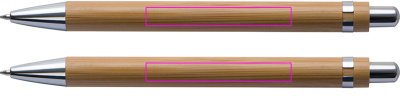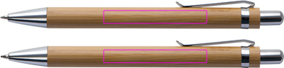 Writing set made of bamboo, including a blue-writing ballpen and a mechanical pencil in a cardboard case. We engrave your logo below the clip on both pens.