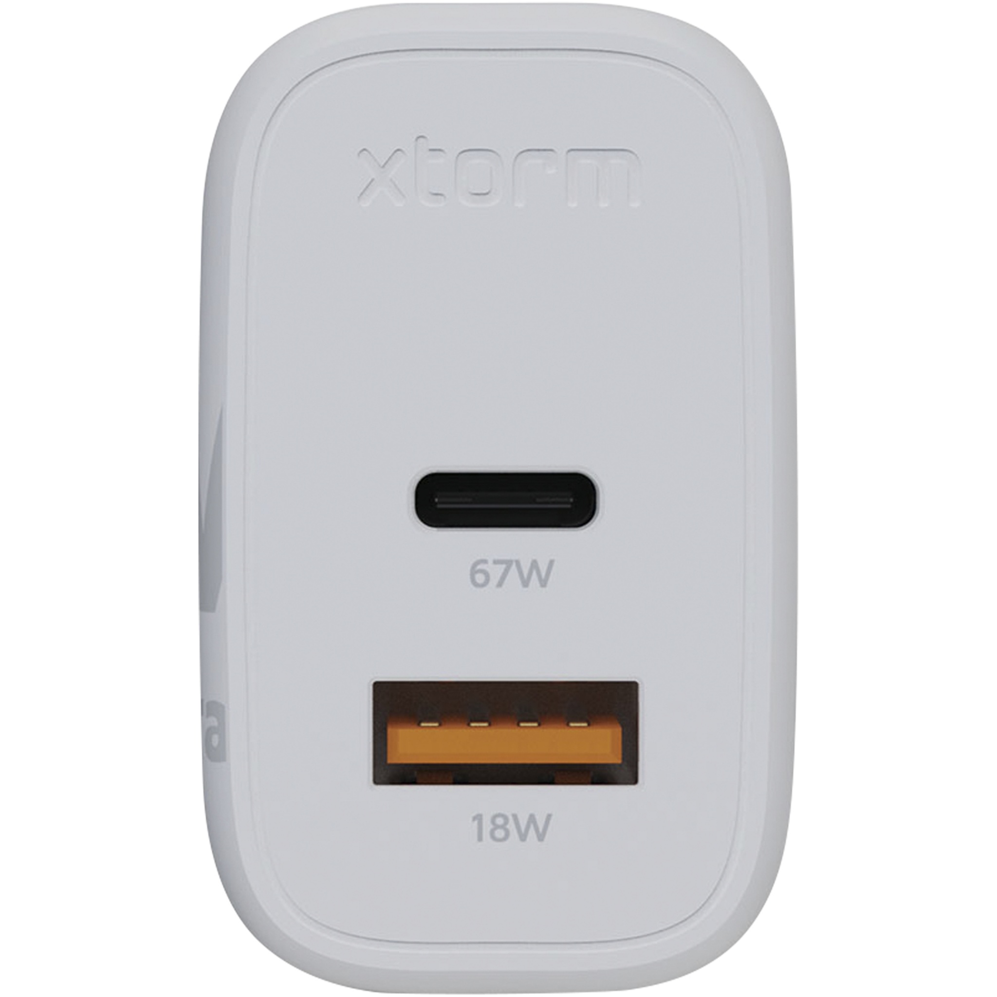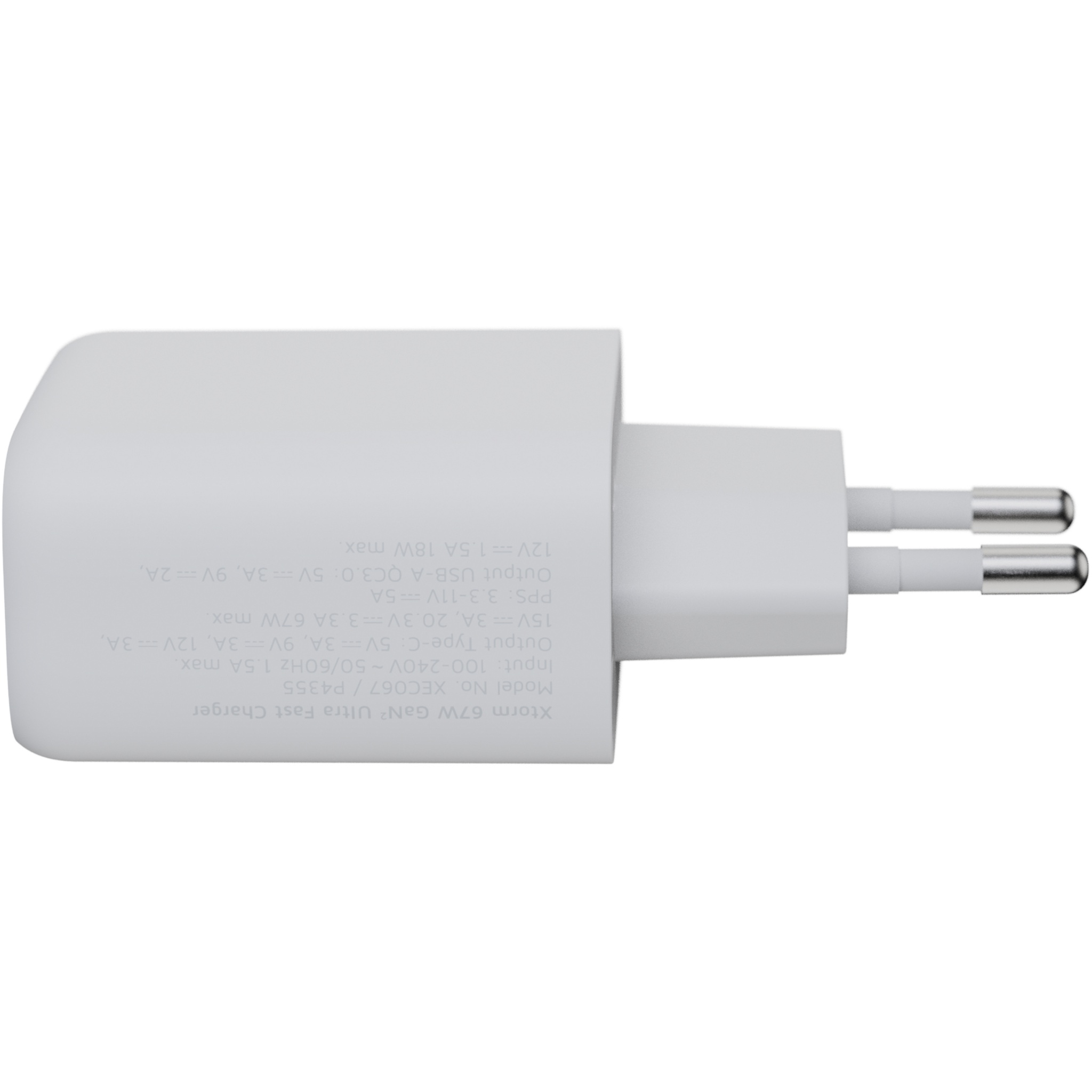 The 67W GaN² Ultra wall charger is designed to be more compact and powerful than ever before. With its compact design and dual-port functionality, this wall charger is perfect for your travels, office, or home. To reduce waste and contribute to a more sustainable future, the charger is made from 97% recycled plastic. Output: 1 USB-C 67W power delivery, and 1 USB-A 18W quick charge 3.0. Delivered with a user manual.