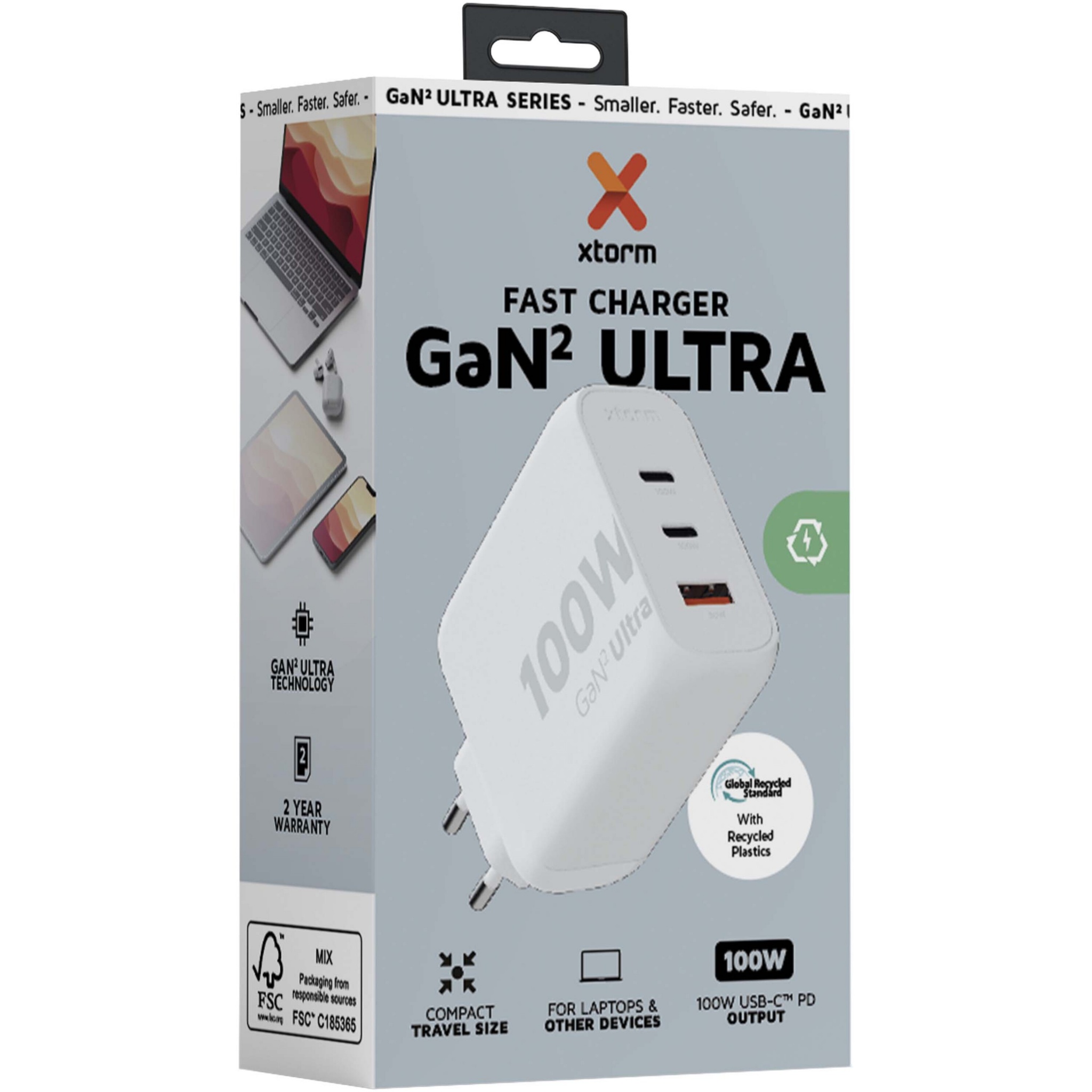 The 100W GaN² Ultra wall charger is designed to be more compact and powerful than ever before. With its compact design and triple-port functionality, this wall charger is perfect for your travels, office, or home. To reduce waste and contribute to a more sustainable future, the charger is made from 97% recycled plastic. Output: 2 x USB-C 100W power delivery, and 1 USB-A 18W quick charge 3.0. Delivered with a user manual.