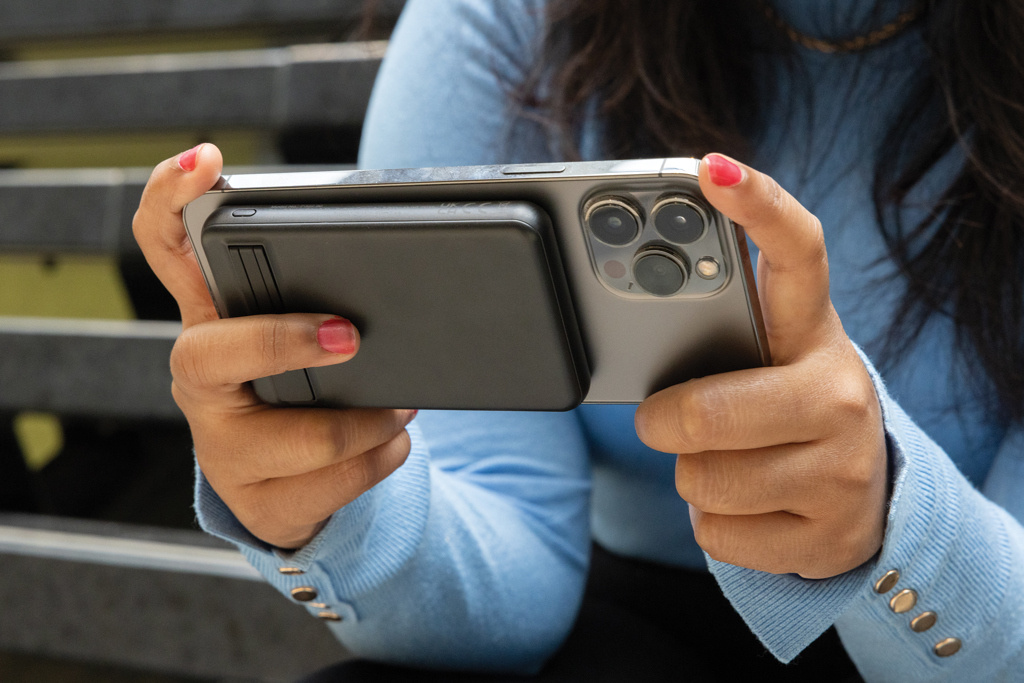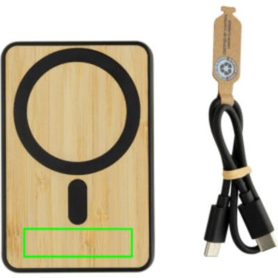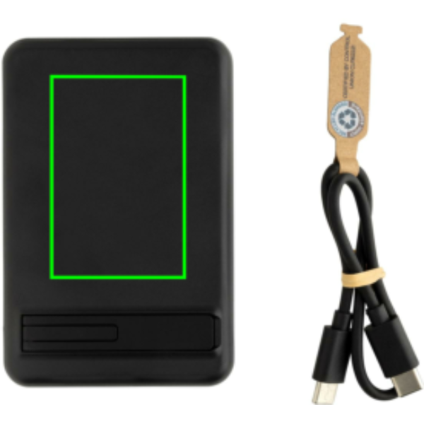 5.000 mAh pocket size powerbank with 5W magnetic wireless charger with a case made out of RCS certified recycled ABS plastic and FSC certified bamboo.. RCS (Recycled Claim Standard) is a standard to verify the recycled content of a product throughout the whole supply chain. Total recycled content: 22 % based on total item weight.The powerbank contains a long lasting grade A 5.000 mAh lithium polymer battery. With integrated phone stand. The power indicators will indicate the remaining energy level so you always know when to re-charge.; Type-C Input 5V/2.4A; Type C output:5V/2A.4A Item and accessories PVC free. Including RCS certified recycled TPE charging cable. Packed in FSC® mix packaging.