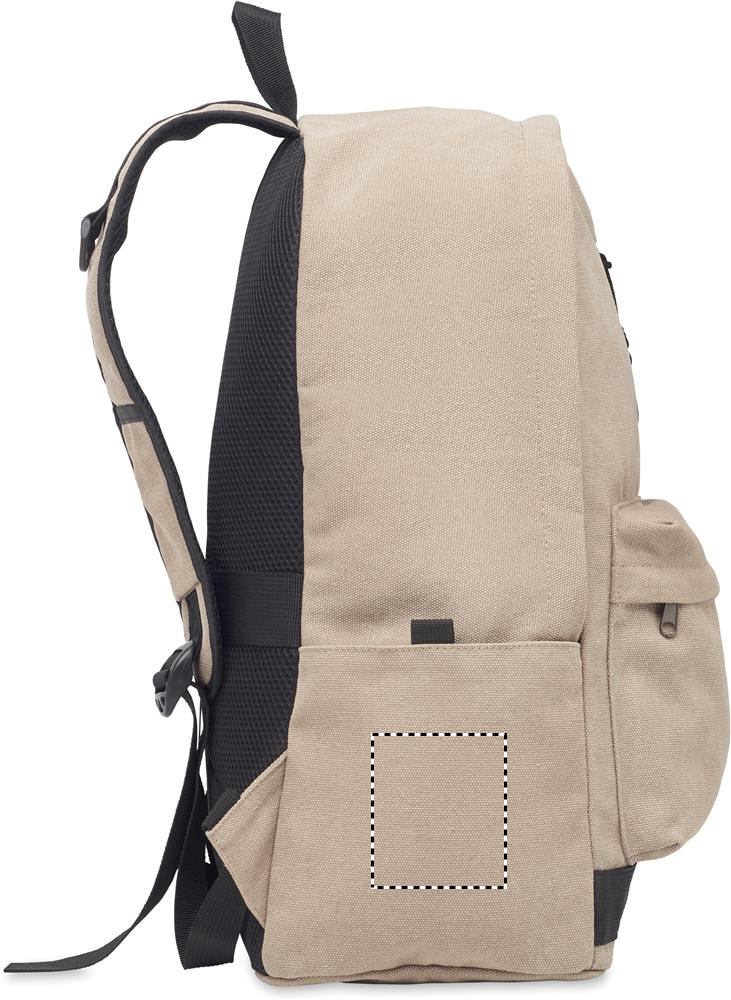 Taaskasutatud pestud lõuendist 15-tolline sülearvuti seljakott. Suur eesmine lukuga tasku sisemise sülearvuti sahtliga. Ees väike lukuga tasku. Kaks külglibisevat taskut. Polsterdatud selja- ja õlarihmad, tagapaneel ja alus. 450 gr/m².