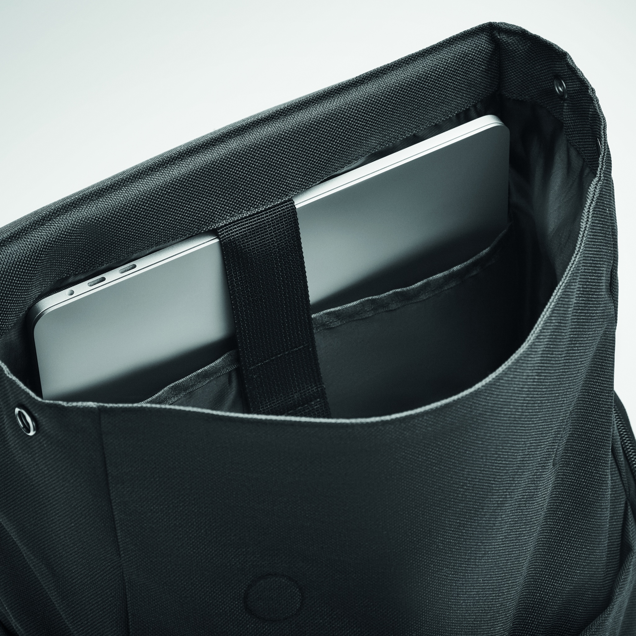 600D 2-tooniline RPET 15-tolline sülearvuti seljakott magnetilise klõpsuga. Polsterdatud sülearvuti sahtel, eesmised lukuga taskud ja 2 küljetaskut.
