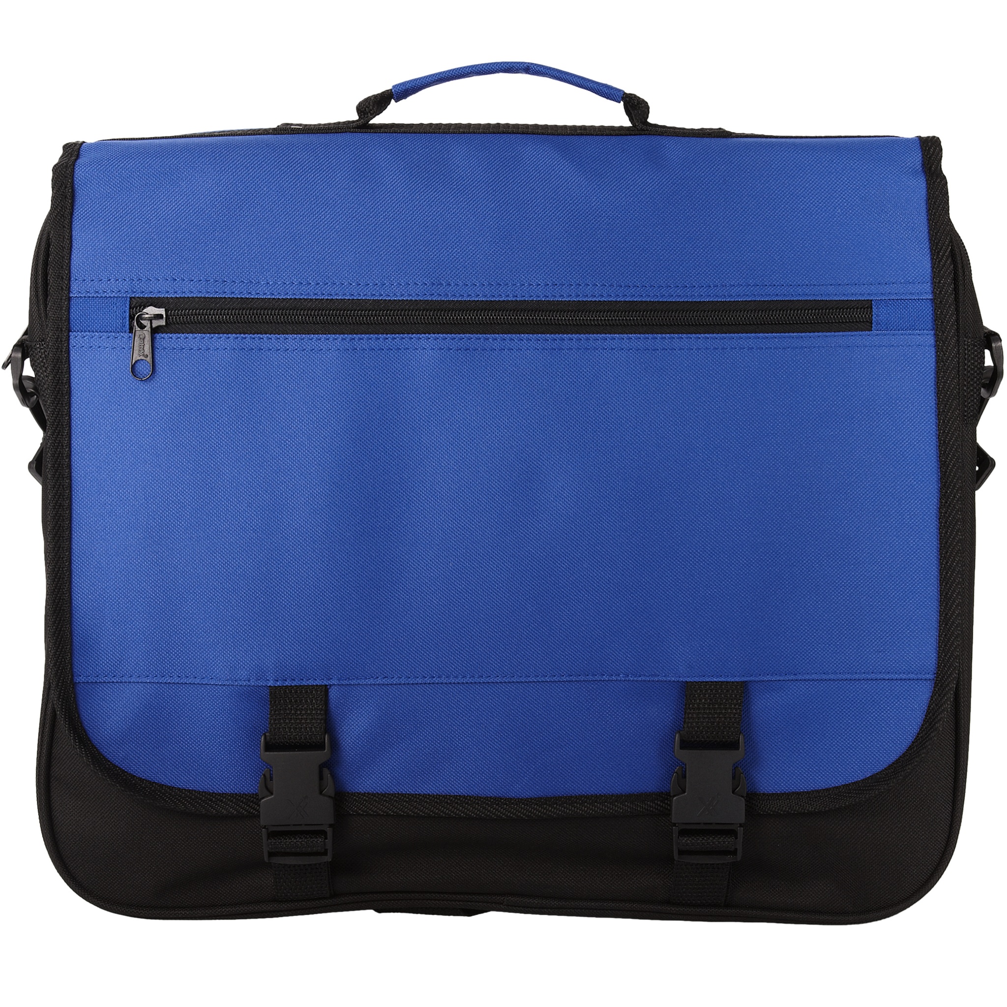 Reguleeritava õlarihmaga näitusekott, pandlaga suletav klapp, tõmblukuga tasku klapil, lukuga põhisahtel ja mitmed avatud taskud klapi all.