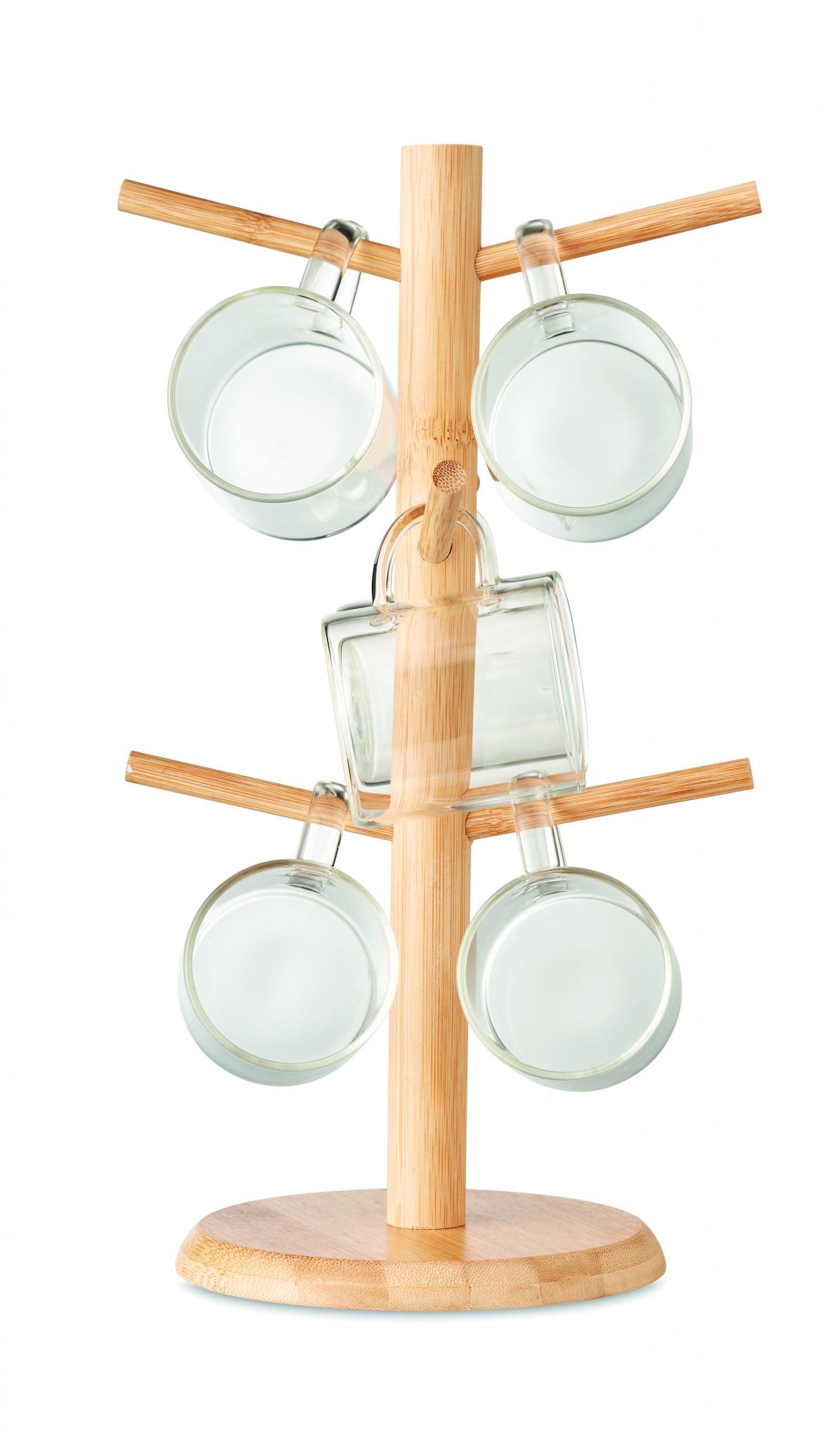 Bambusest topsihoidja komplekt, mis sisaldab 6 boorsilikaatklaasist tassi. Mahutavus: 200 ml tassi kohta. Vajalik toote kokkupanek. Bambus on looduslik toode, ühe eseme värvis ja suuruses võib esineda väikesi erinevusi, mis võivad mõjutada lõppviimistlust.