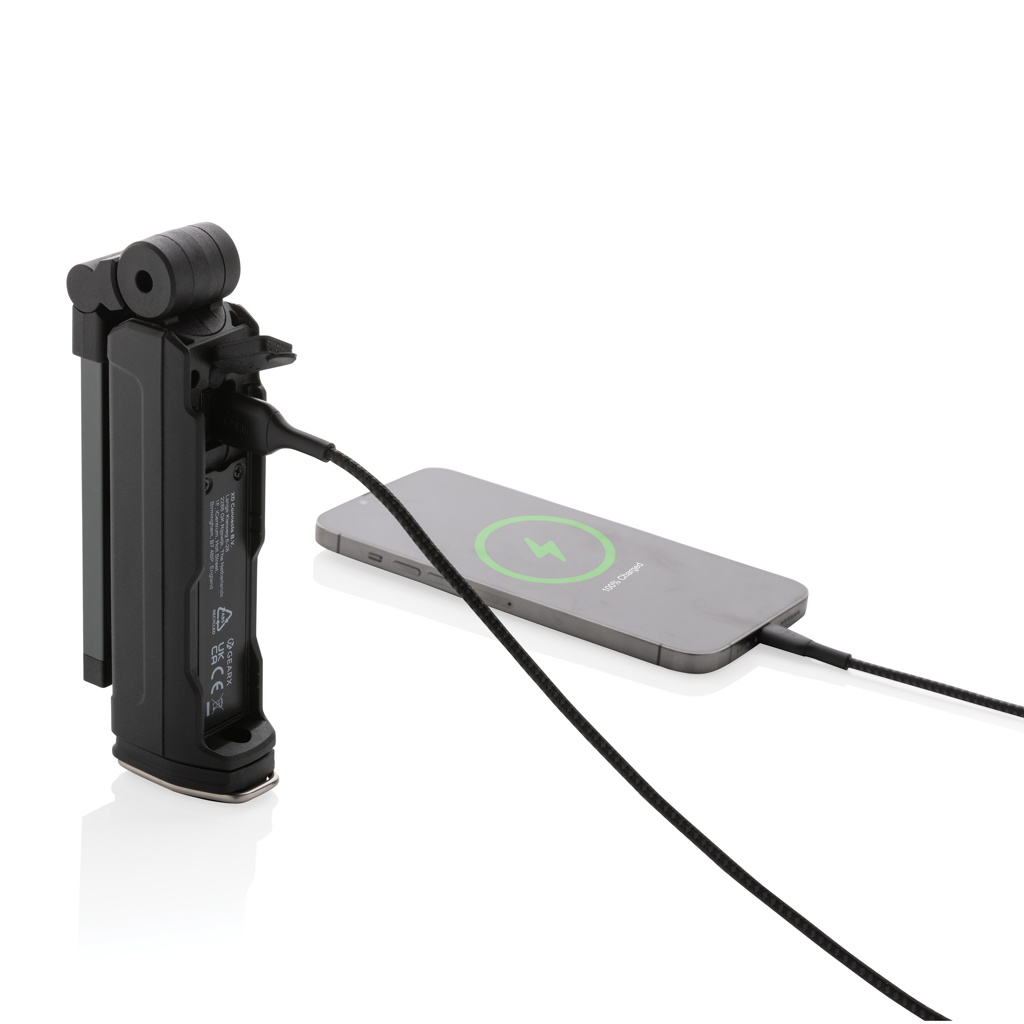 Funktsionaalsus ja disain tulevad kokku selles taaslaetavas suure jõudlusega töövalgustis, mis on valmistatud RCS-sertifikaadiga taaskasutatud ABS-plastist. Taaskasutatud kogusisu: 25% toote kogumassist. RCS-sertifikaat tagab taaskasutatud materjalide täielikult sertifitseeritud tarneahela. Vihmakindel töötuli kasutab taaslaetavat A-klassi 2000 mah liitiumakut, nii et patareisid pole vaja vahetada. Laadige lihtsalt oma USB-pesa ja kaasasoleva laadimisaluse kaudu uuesti. Töövalgustiga on kaasas 600 luumenine COB valgus ja 200 luumenine LED valgus. 4 režiimiga: LED, COB, COB punane, COB hädaabi vilkumine. Valgust saab täielikult 360 kraadi ümber pöörata. Magnetiga ja konks allääres. C-tüüpi pordiga laadimiseks ja USB A-pordiga mobiilseadmete laadimiseks. Tööaeg ühe laadimisega: 3 tundi.