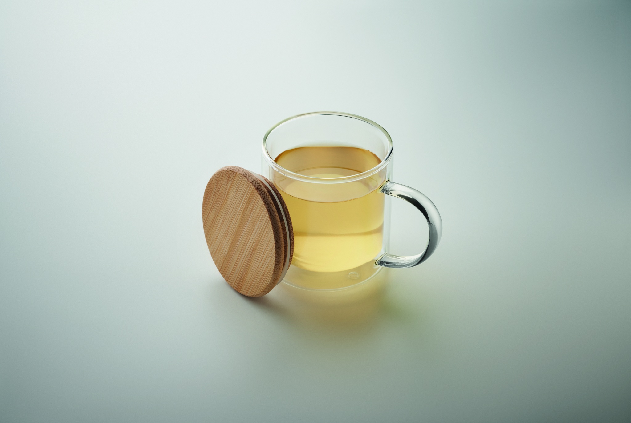 Kaheseinaline boorsilikaatklaasist kruus bambusest kaane ja värviliste sangadega. Mahutavus: 300 ml.