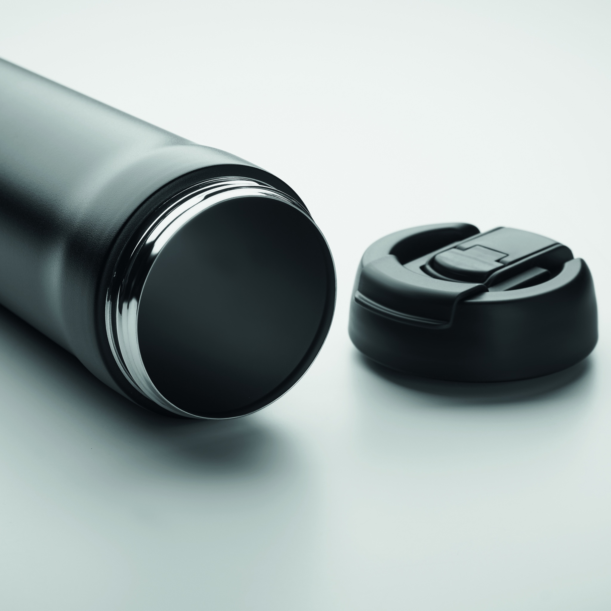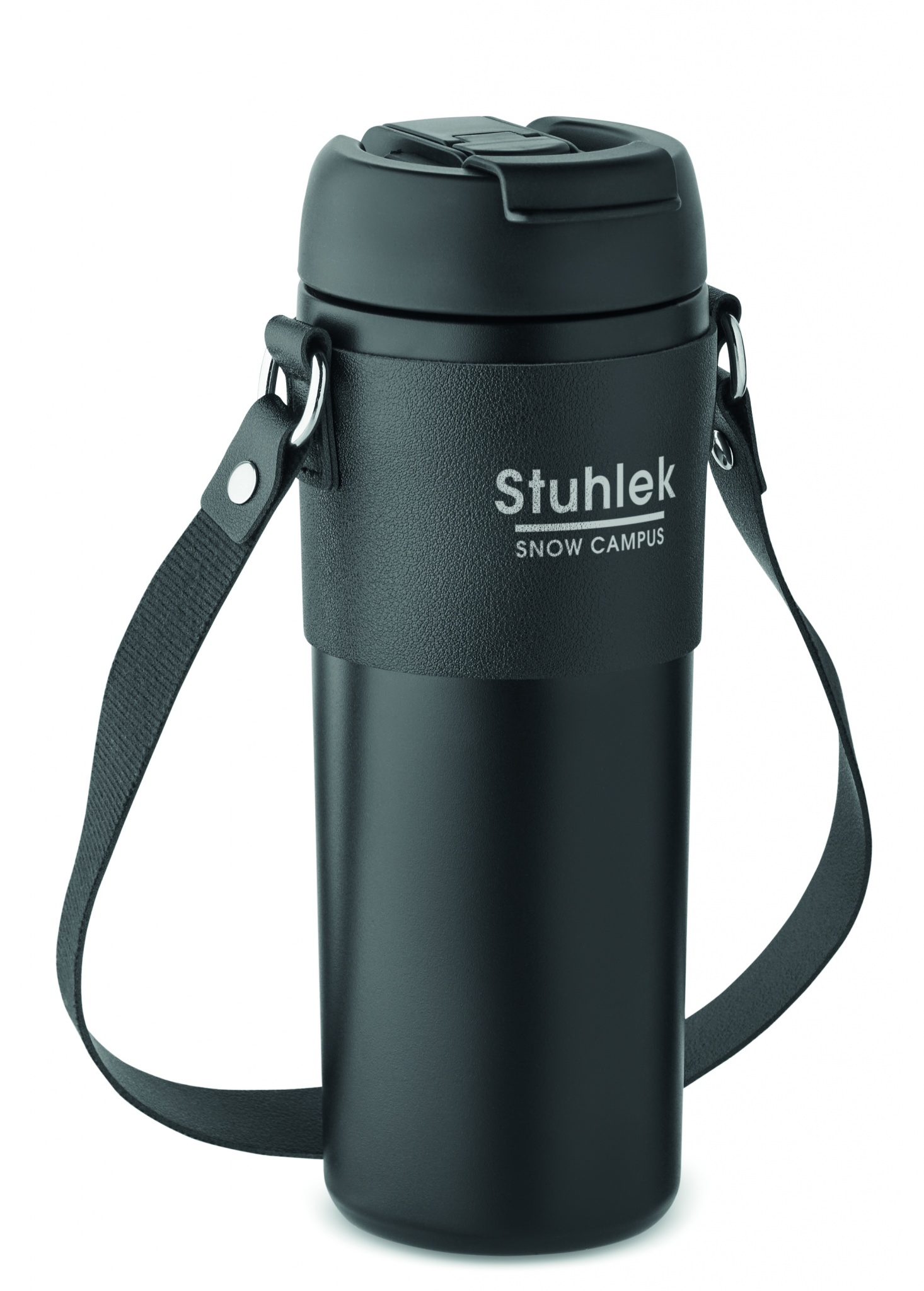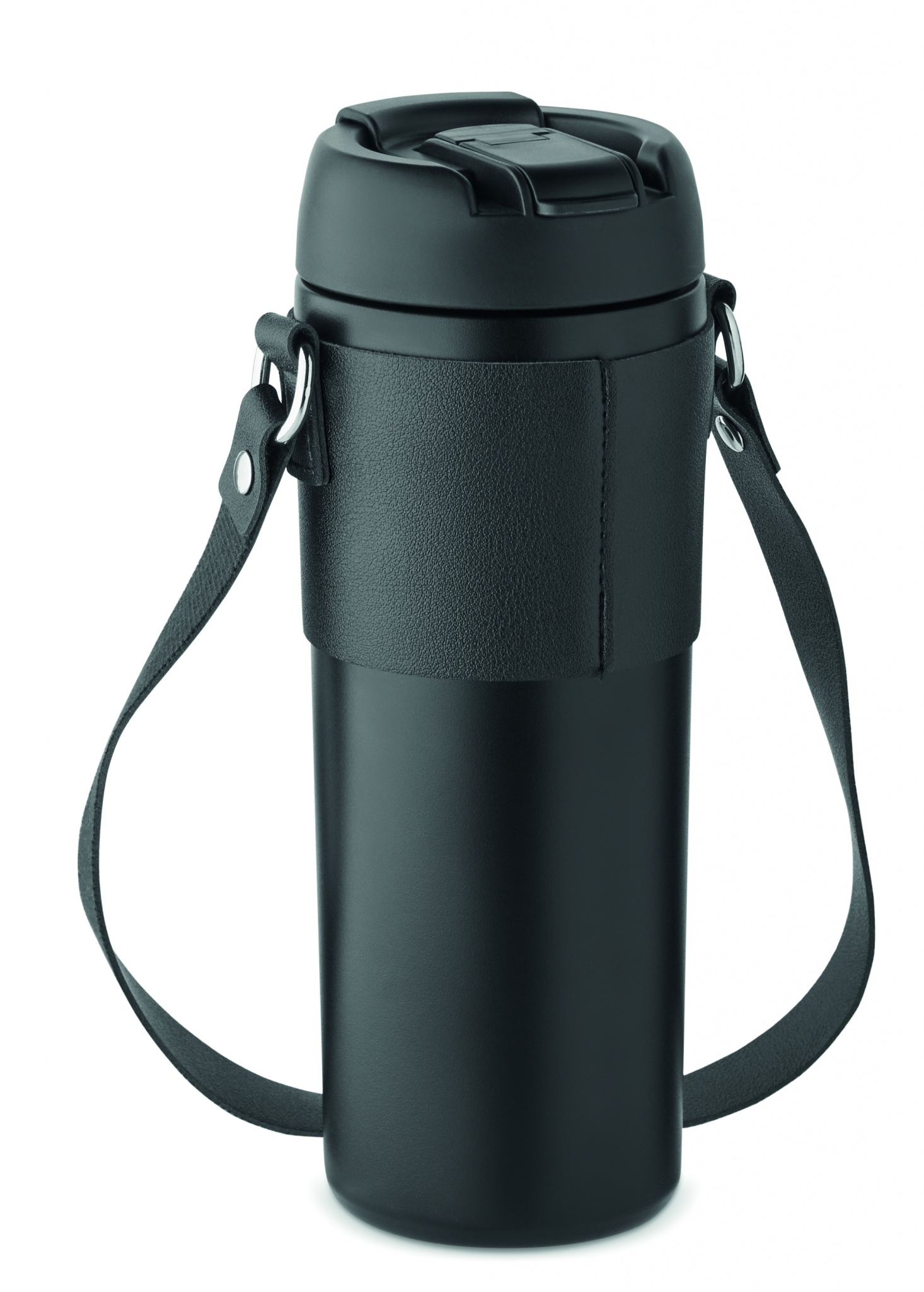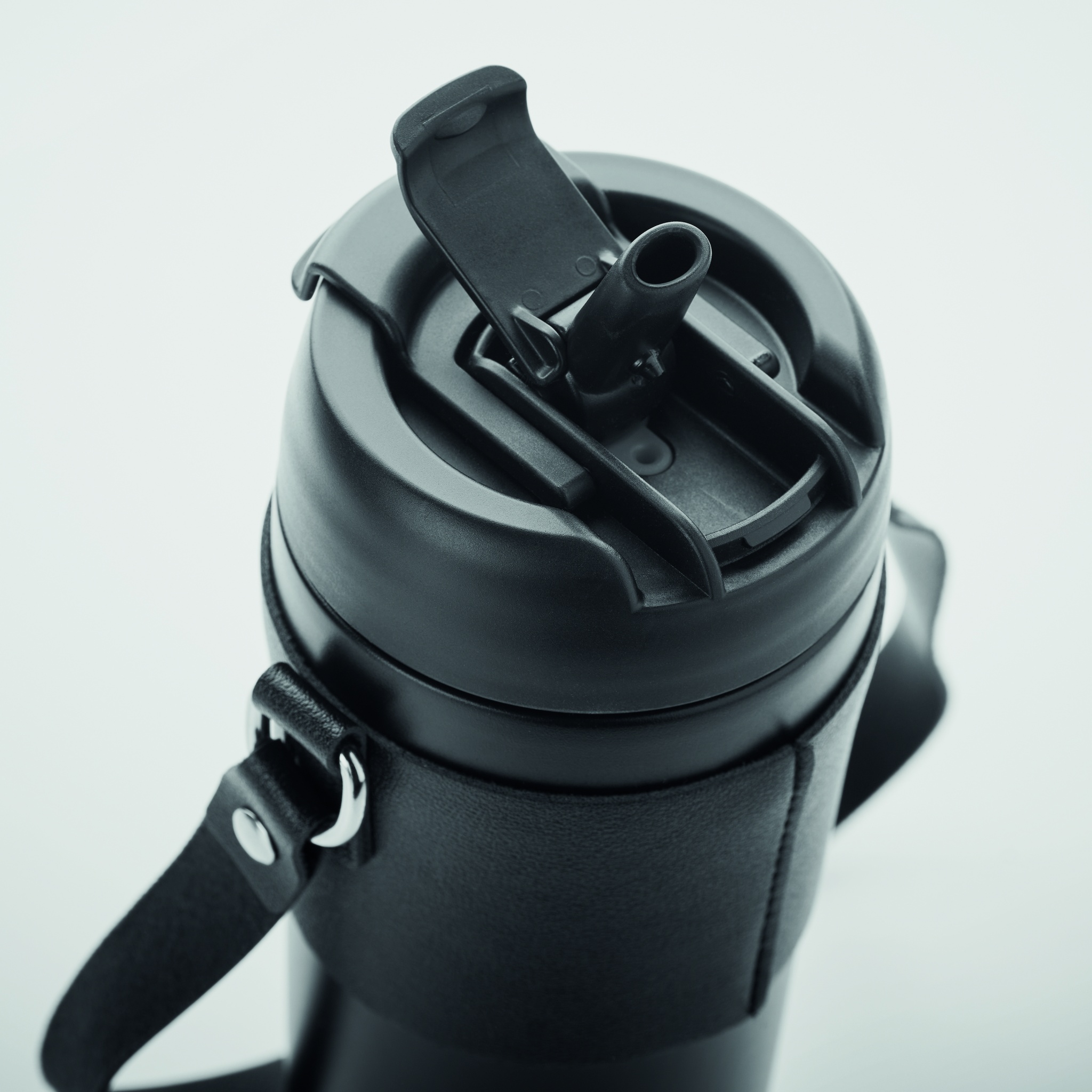 Kaheseinaline roostevabast terasest pulbervärvitud trummel PP kaanega (2-in-1 õlgedest kaas) ja PU kanderihmaga. Lekkevaba. Mahutavus: 700 ml.