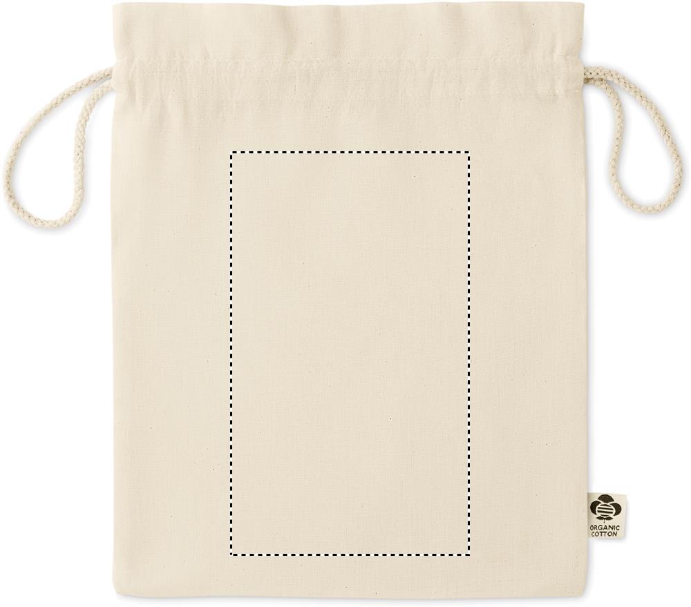 Orgaanilisest puuvillast keskmise suurusega kingituseks tõmmatud nöörikott. Suurus ca. 25 x 32 cm. 105 gr/m².