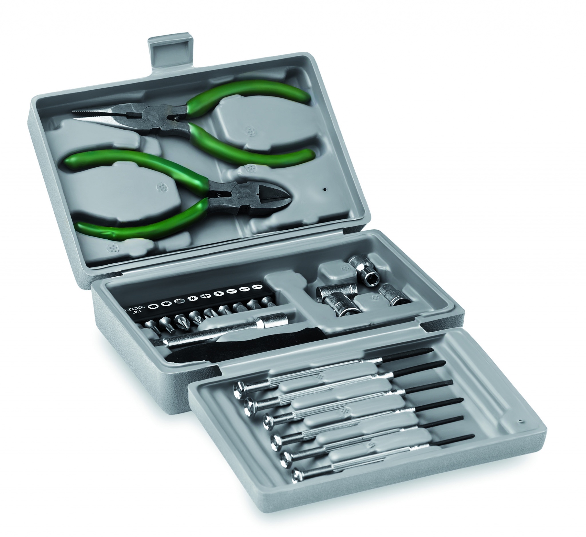 Kokkupandav 25-osaline tööriistakomplekt, mis sisaldab pintsetid, 6 tk kruvikeerajate komplekt, pikendus, 4 tk pistikupesa komplekt, lameda otsaga tangid, lõiketangid ja 10 tk plastkarpi pakitud otsakukomplekt.