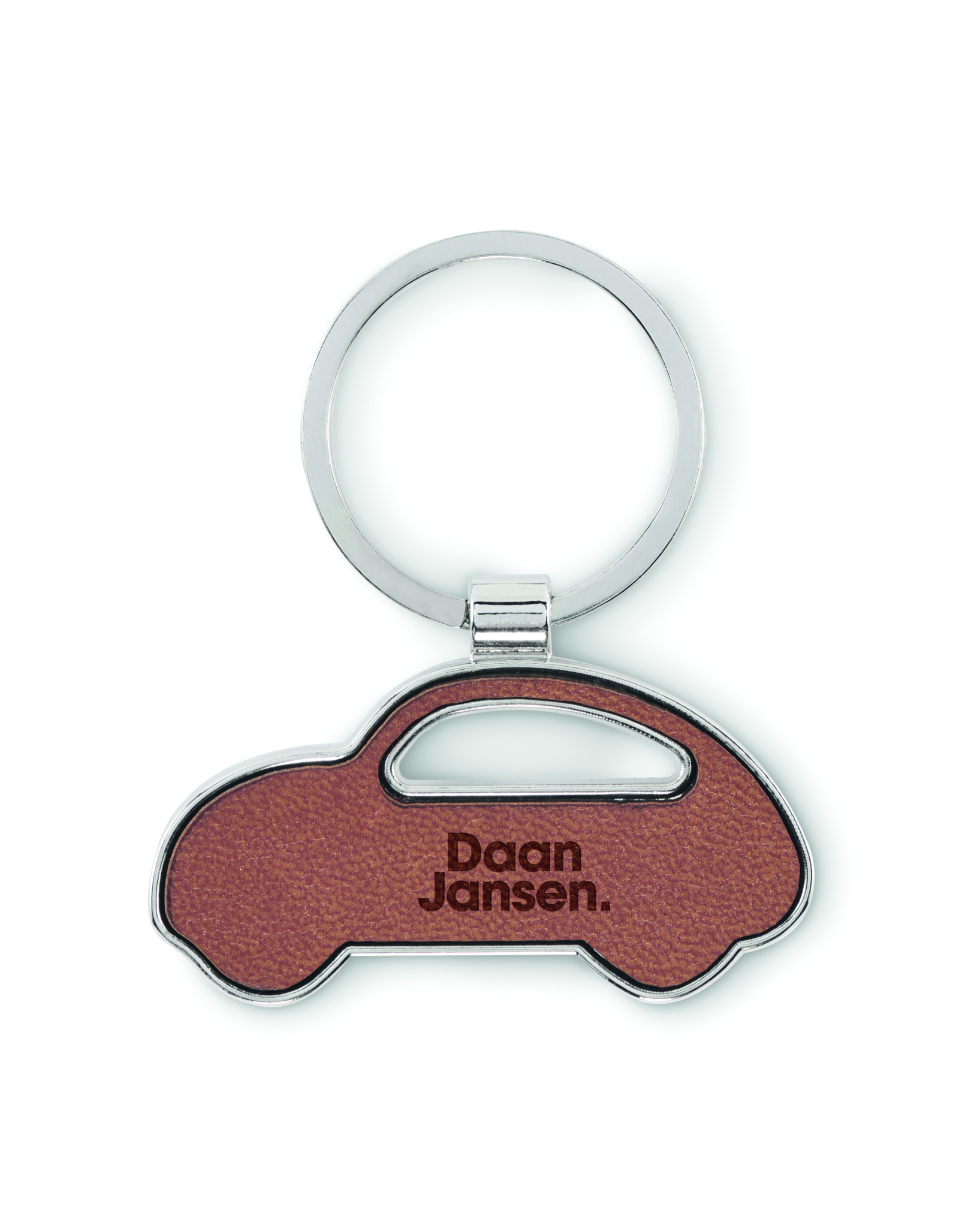 Autokujuline metallist võtmehoidja taaskasutatud PU-nahast detailiga.