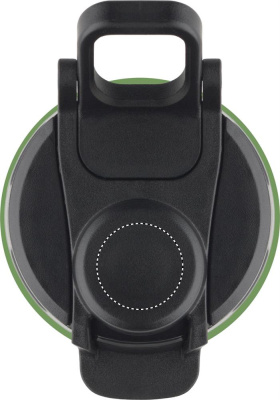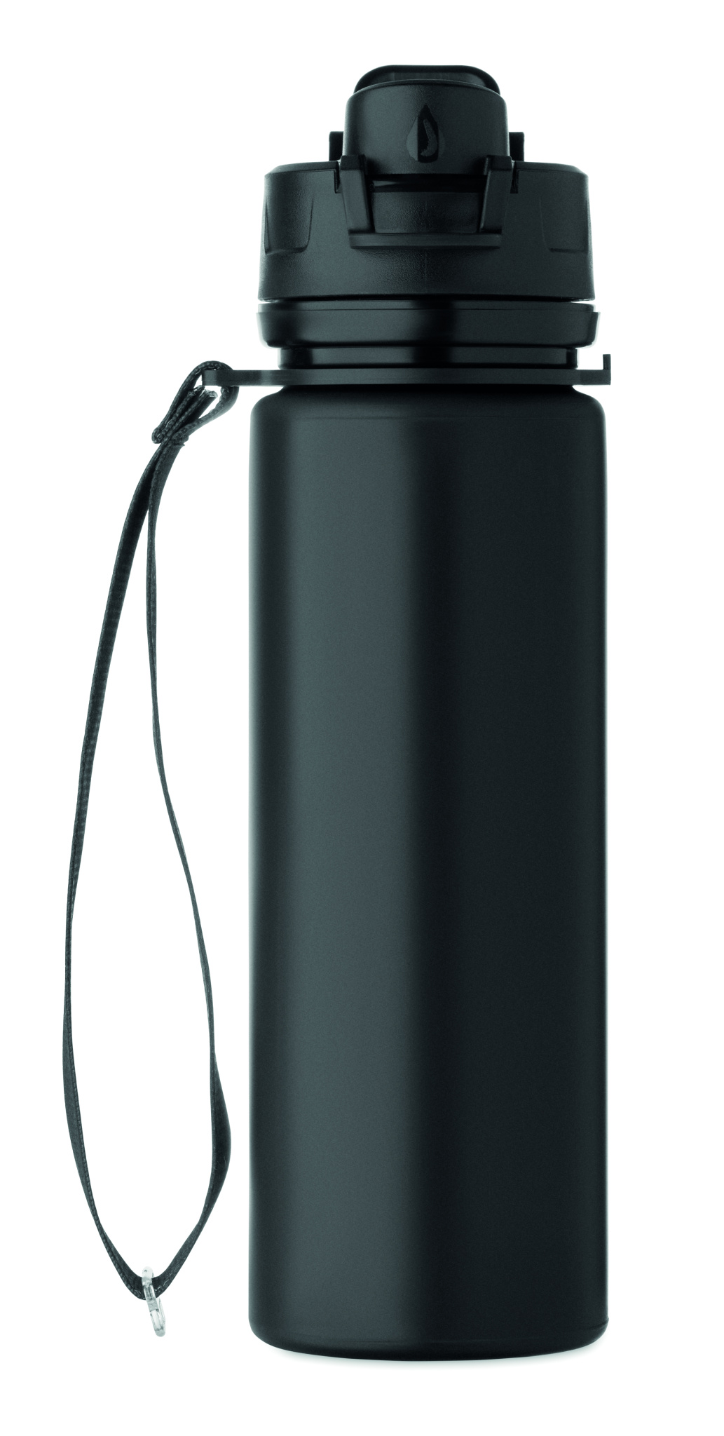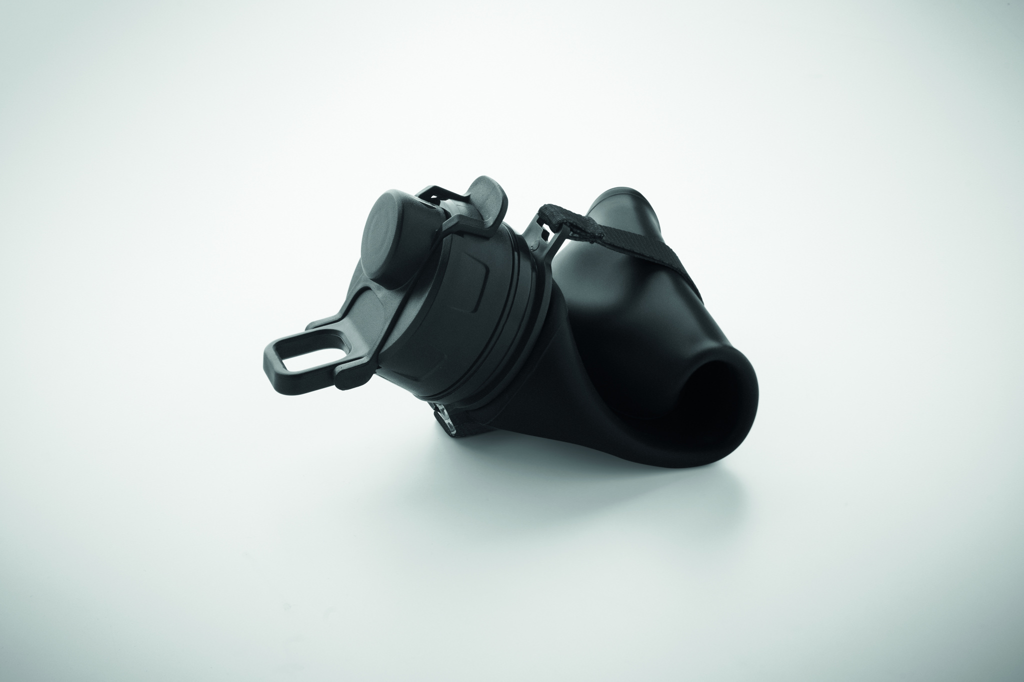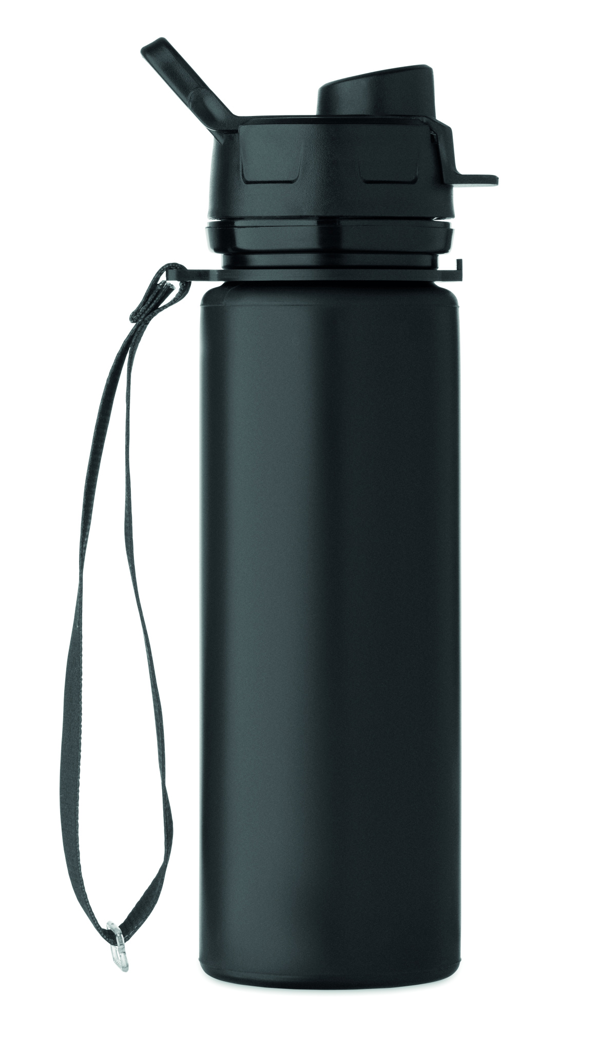 Kokkupandav silikoonist spordipudel PP-kaane, käepideme, polüesterrihma ja läbipaistva pandlaga. Lekkevaba. Maht: 500 ml.