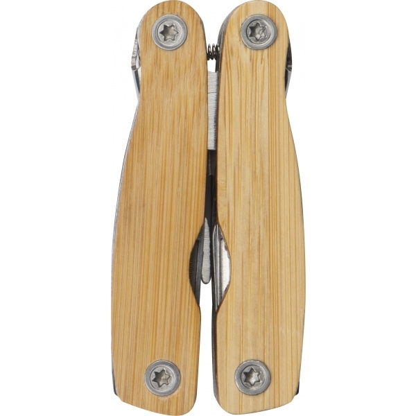 Roostevabast terasest valmistatud multifunktsionaalne tööriist, millel on bambusest kestad ja erinevad tööriistad nagu tangid, nuga, saag, kruvikeeraja, viil jne. Teie logo graveeritakse käepideme ühele küljele.