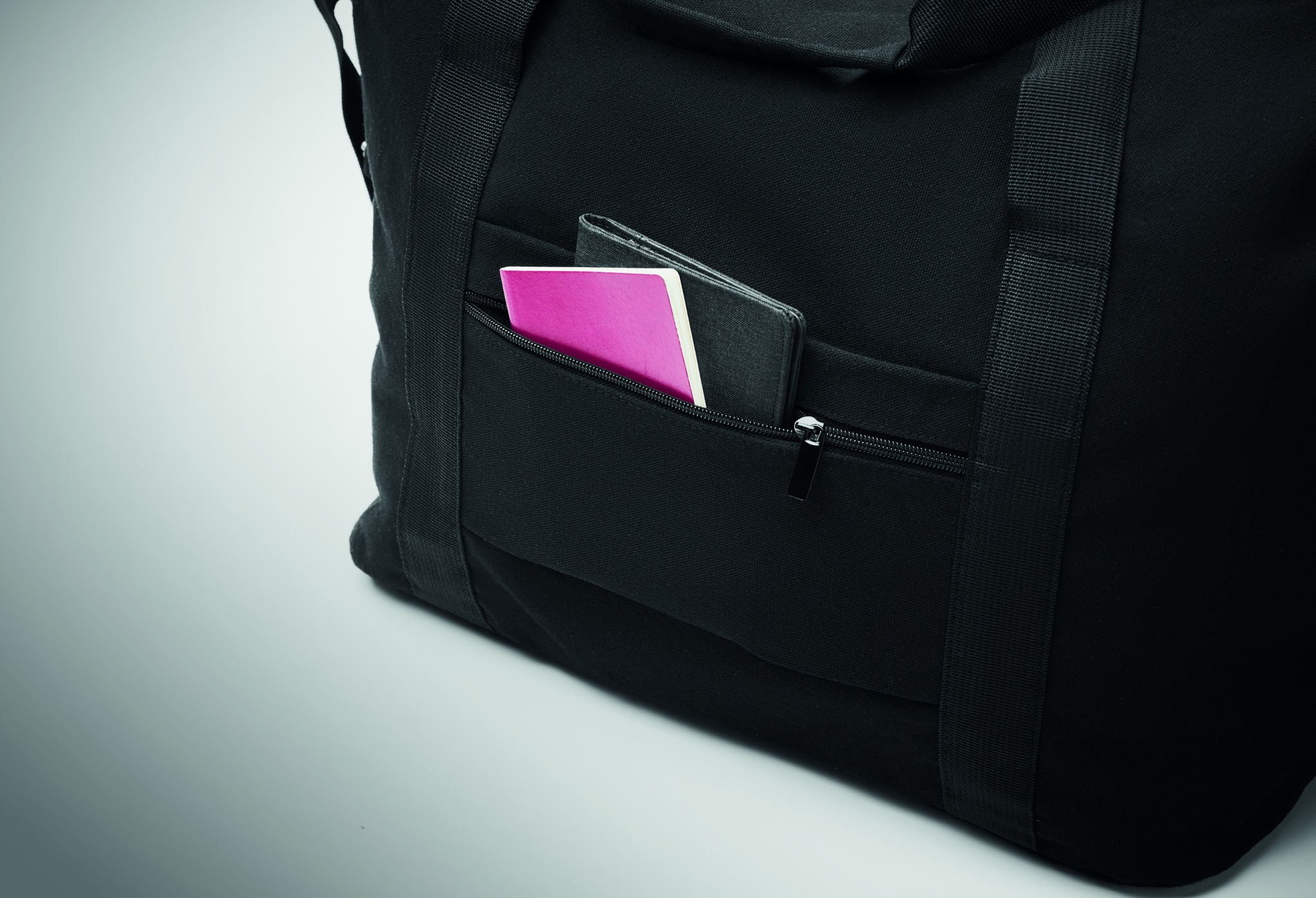 Nädalavahetusekott taaskasutatud tarbimiseelsest puuvillast ja taaskasutatud polüestrist (70%/30%), voodriga 210D RPET polüester. Sellel on eesmine tasku, lukuga tagatasku, eemaldatav ja reguleeritav õlarihm ning polsterdatud põhi. Käru hoidik tagaküljel.