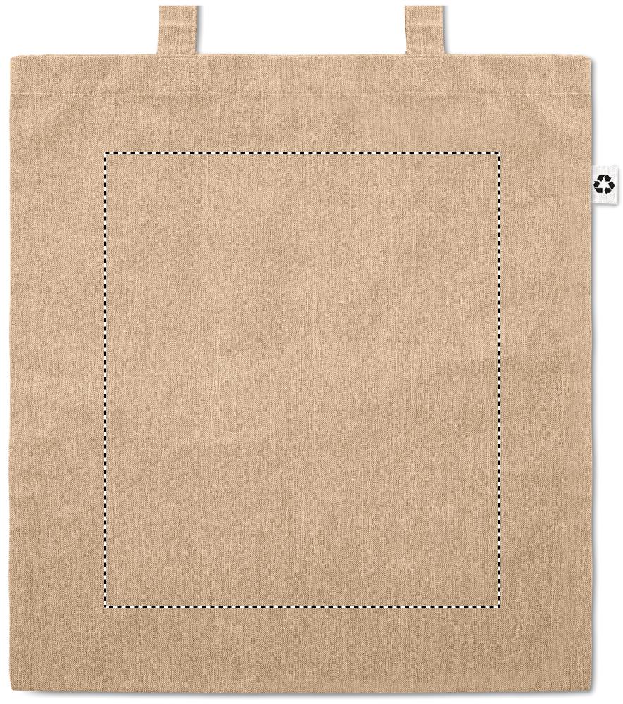 2-tooniline taaskasutatud puuvill (20%) ja taaskasutatud polüester (80%) pikkade sangadega ostukott. u. 140 gr/m². See üksus võib pärast printimist kokku tõmbuda.