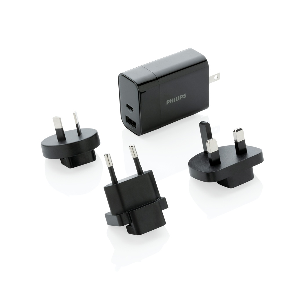 Philipsi ülikiire 30 W PD reisilaadija. Mugava reisikotiga. Kaasas 4 pistikut; integreeritud USA pistik ja vahetatavad AU, UK ja EU pistikud. Sisend: 100-240V, 50-60Hz 0,7A Väljund USB A 5V/2.4A Type-C 5V/3A, 9V/2A, 12V/1.5A. Pakitud Philipsi kinkekarpi.