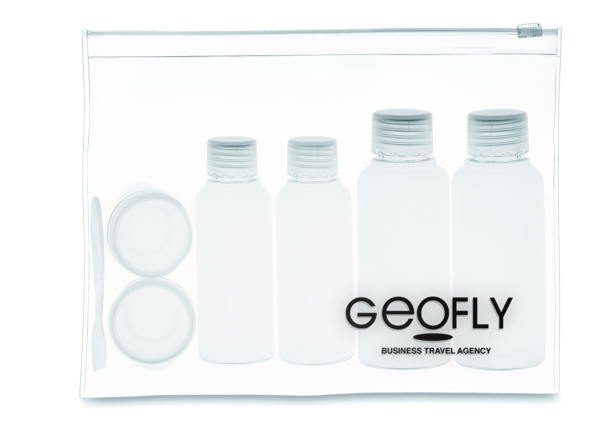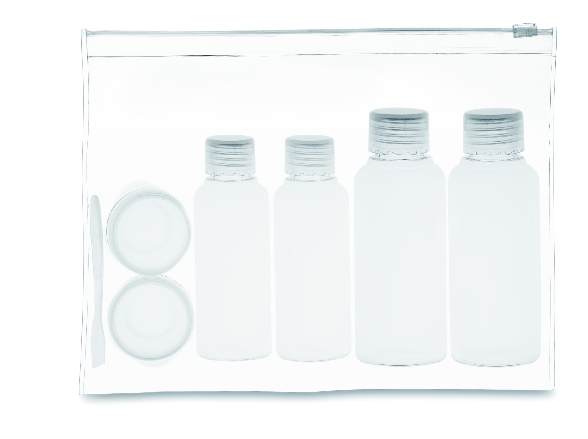 Lennuki reisikott, mis sisaldab 6 tühja plastpudelit. (100 ml, 50 ml ja 10 ml)