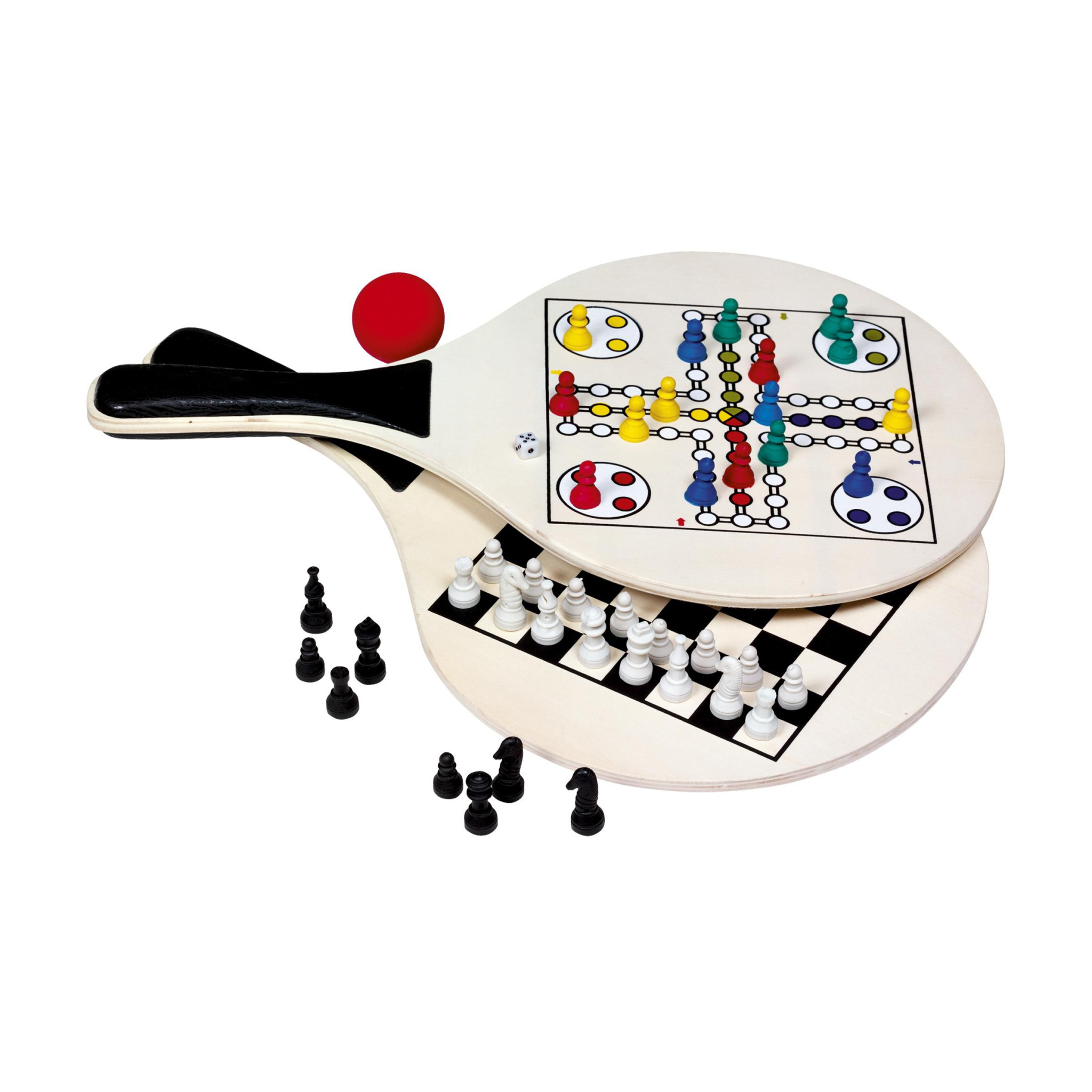 Puidust reketid, mis sisaldavad 2 lauamängu. Sealhulgas palli ja mängunupud. Nailonkarbis.