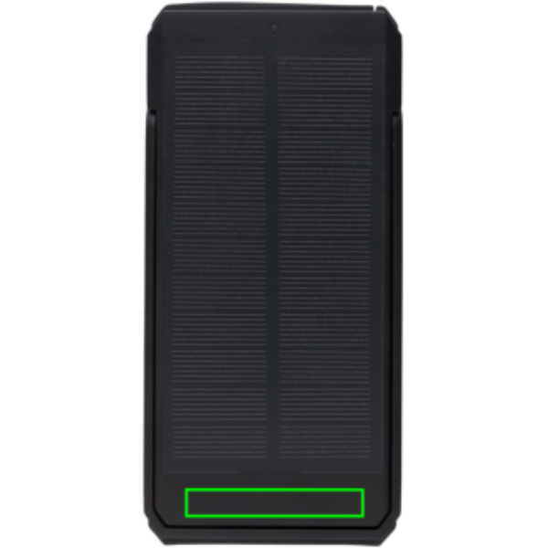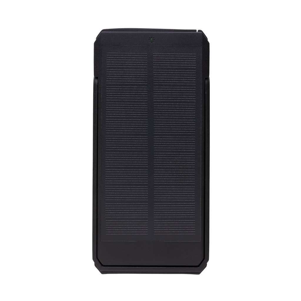 10 000 mAh päikesepatarei, mis on valmistatud RCS-sertifikaadiga taaskasutatud ABS-ist. Taaskasutatud kogusisaldus: 18% eseme kogukaalust. RCS-sertifikaat tagab taaskasutatud materjalide täielikult sertifitseeritud tarneahela. Powerbank kasutab kvaliteetseid monokristallilisi päikesepaneele, mille konversioonimäär on 19%. Tasu määr sõltub tingimustest. Integreeritud statiivifunktsiooniga päikesepaneelide kasutamiseks optimaalse nurga all. Akupank sisaldab kauakestvat A-klassi 10 000 mAh liitiumakut. Laadimiskiirus päikeseenergia: 5V/200mA. Sisendtüüp C: 5V/2A. Väljund: USB A: 5V/2A Tüüp C: 5V/2A. Toode ja tarvikud PVC-vaba. Kaasa arvatud RCS-sertifikaadiga taaskasutatud TPE laadimiskaabel. Pakitud FSC® segupakendisse. Registreeritud disain®
