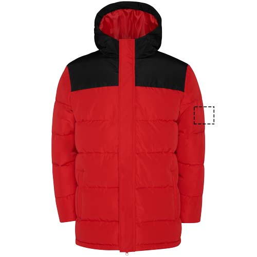 Polsterdatud jakk fikseeritud kapuutsiga. Ees tõmblukk kaetud plekiga. Lõuakaitse. Kaks lukuga küljetaskut. Elastsed kätised.