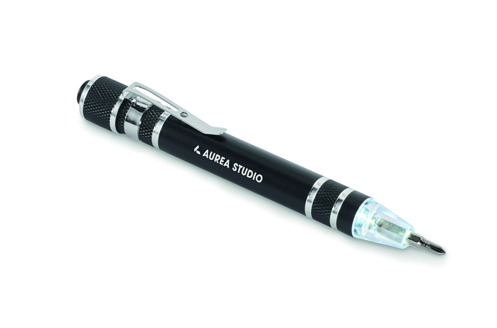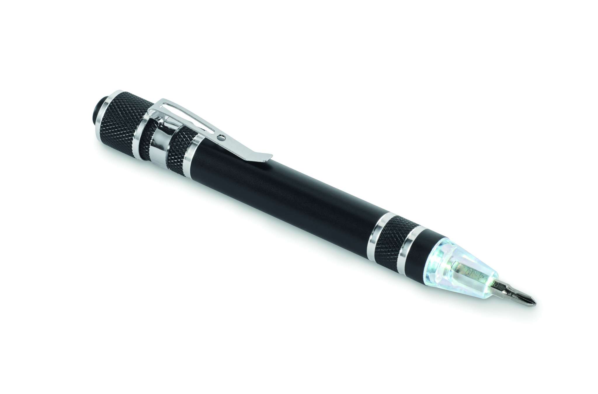Pliiatsi kujuga taaskasutatud alumiiniumist multitööriist taskulambiga. Kaasas 3 lameotsaga ja 3 Phillipsi kruvikeeraja pead. Kaasas 4 nööppatareid LR41.