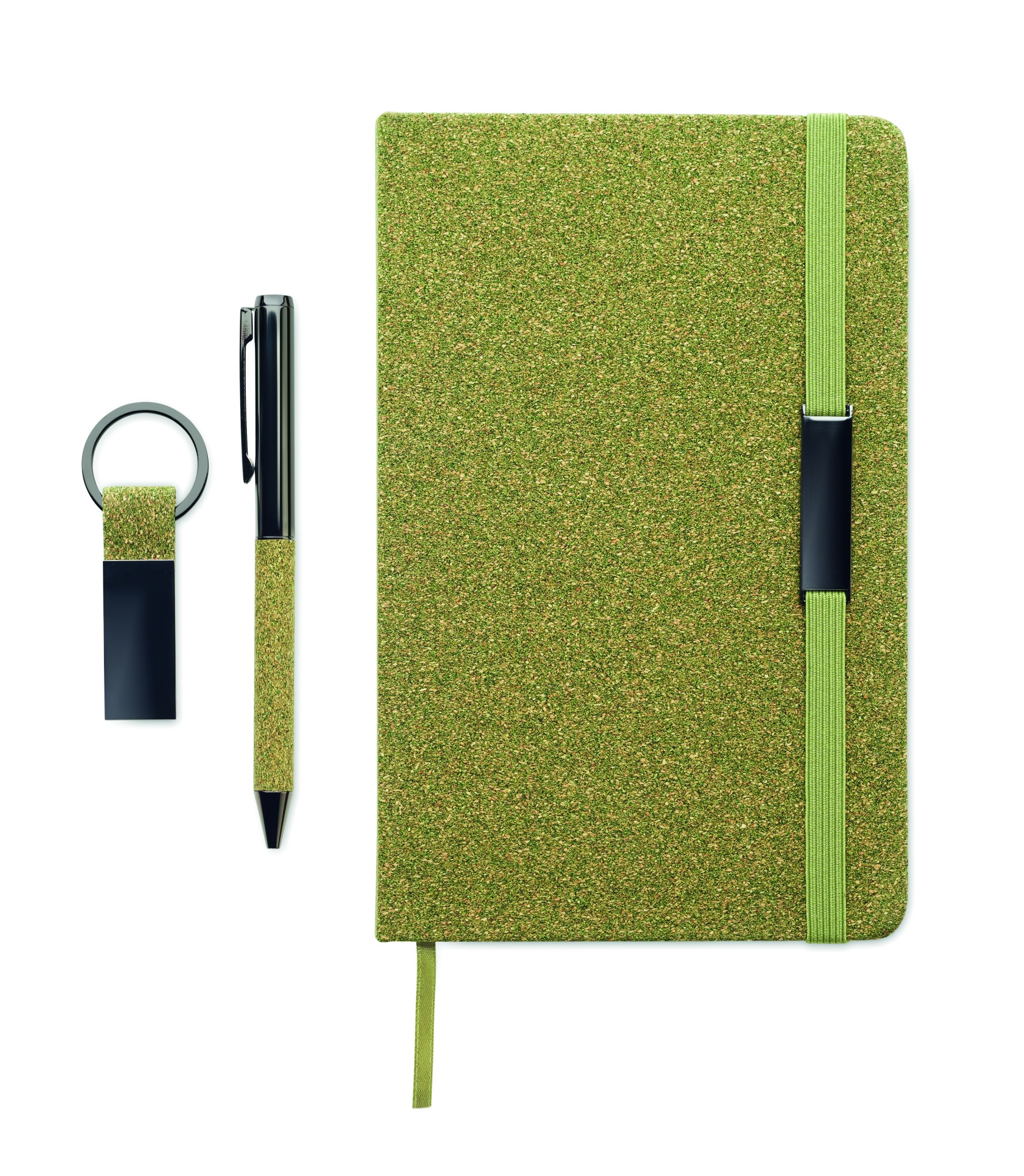 Kovakantinen A5-muistikirja, 160 viivoitettua kierrätyspaperisivua (80 arkkia/70 g/m²), kierretty metallinen kuulakynä ja avaimenperä. Yksityiskohdat on valmistettu 20 % teenporoista, 30 % korkista, 50 % polypuuvillakankaasta. Metalliset yksityiskohdat kuminauhassa . FSC®-certified | FSC MIX CREDIT, N7.1, FSC-C213206