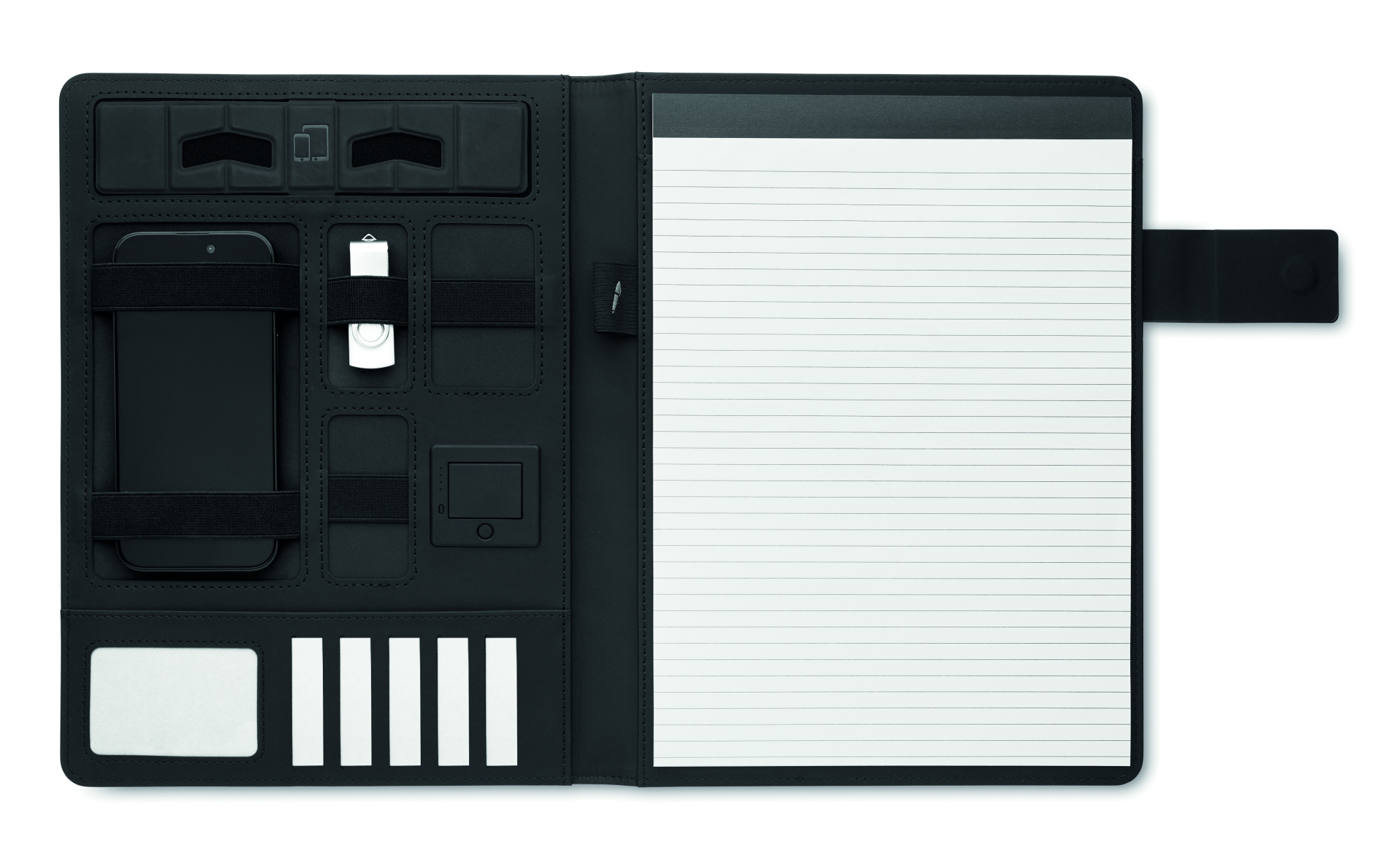 A4-kokoinen neuvottelukansio pellava-PU-kuorella. 5000 mAh virtapankki ja 15 W magneettinen langaton laturi. 20 arkin muistilehtiö. Useita sisäisiä lokeroita. Magneettinen suljin. Elastinen kynäteline.