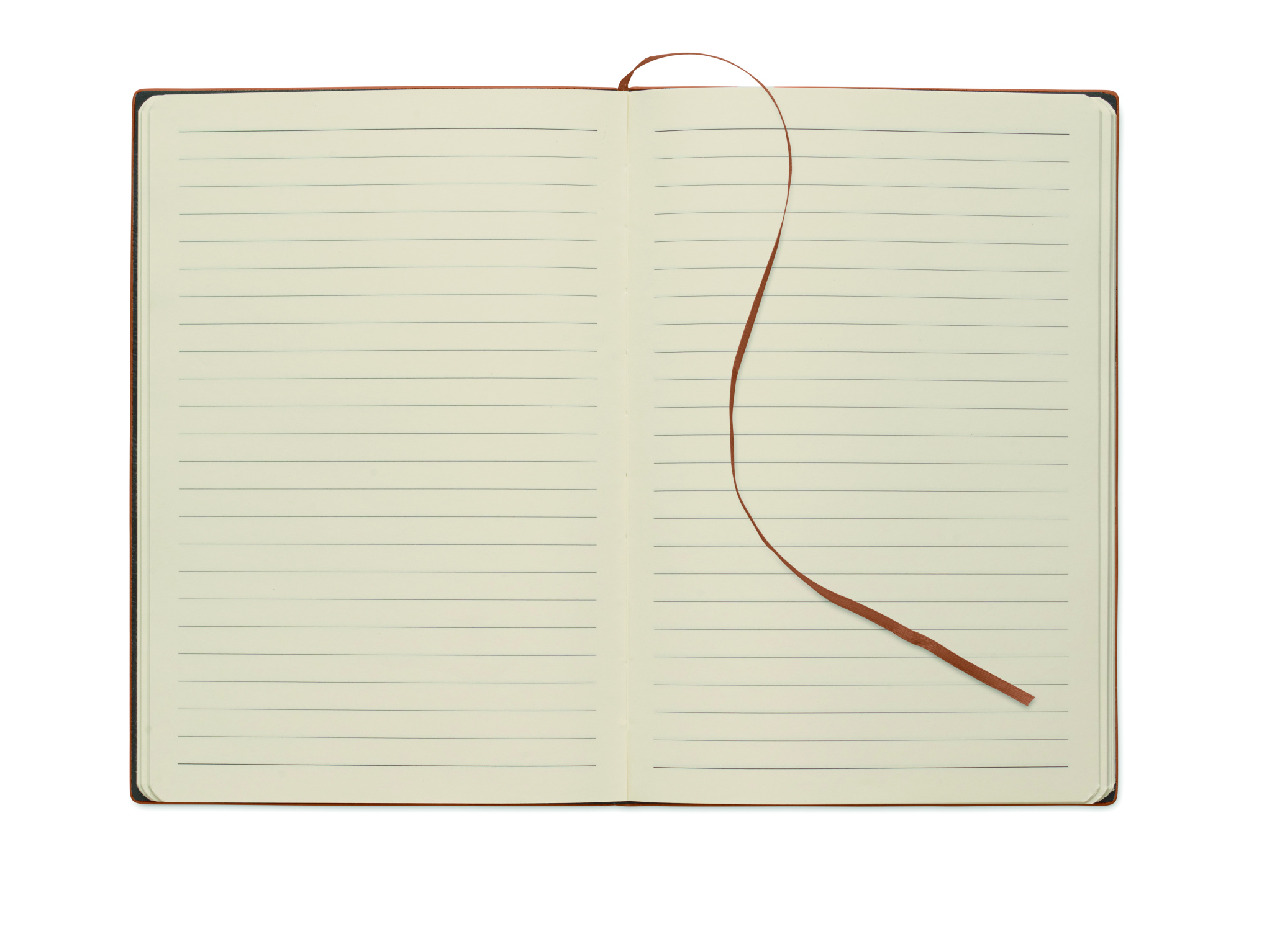 A5-kokoinen muistikirja, jossa pehmeä, savunruskea kuvioitu PU-kansi. Valmistettu 40 % kierrätetystä kuluttajajätteestä ja 60 % PU-muovista, 160 viivoitettua sivua, 70 g/m² kierrätyspaperista (80 arkkia). Sävysävyyn kirjanmerkkinauha.
