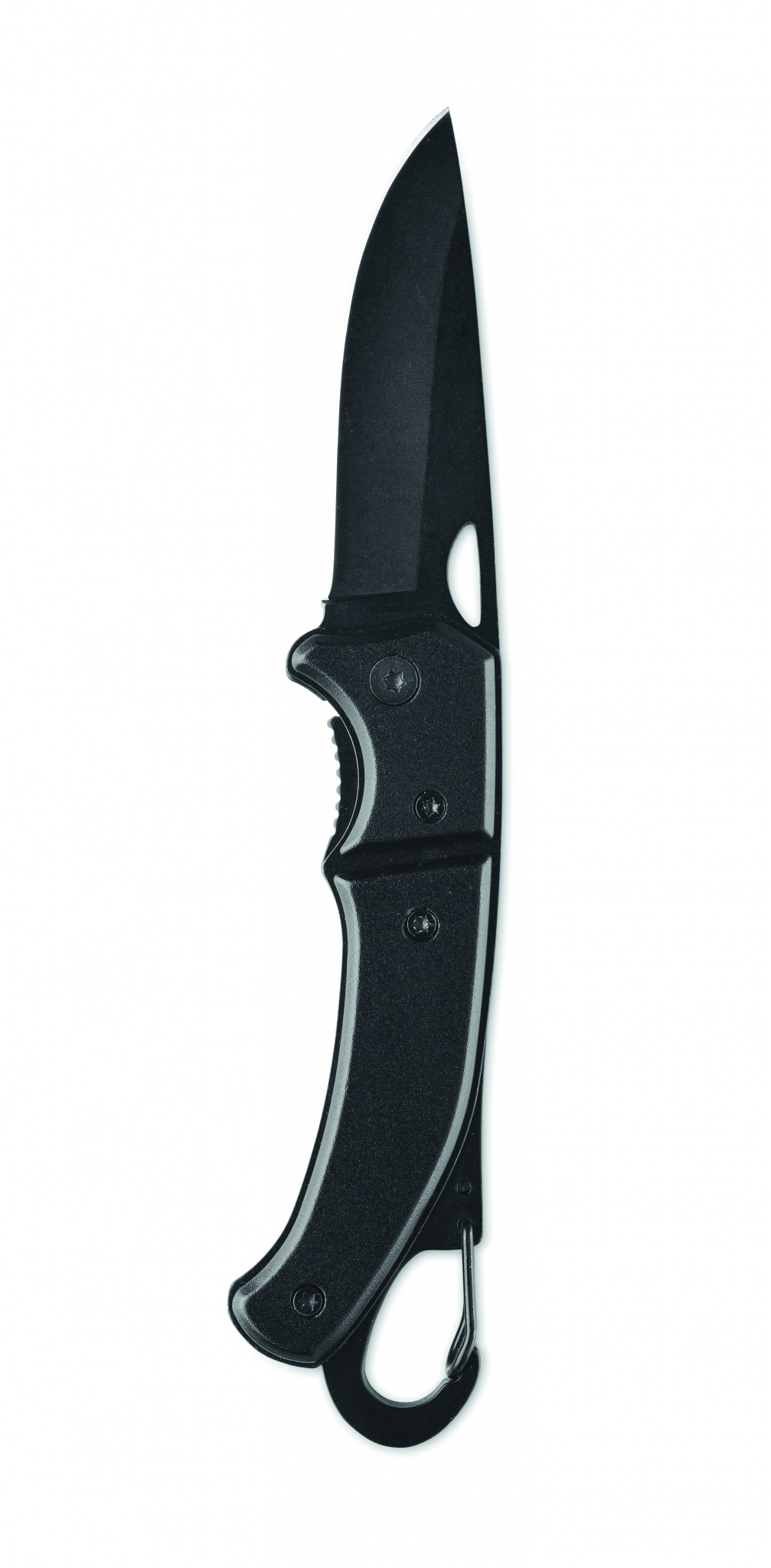Alumiininen taitettava veitsi karabiinilla. Terä ruostumatonta terästä. Karabiini ei ole tarkoitettu kiipeilyyn (ei-ammattikäyttöön).