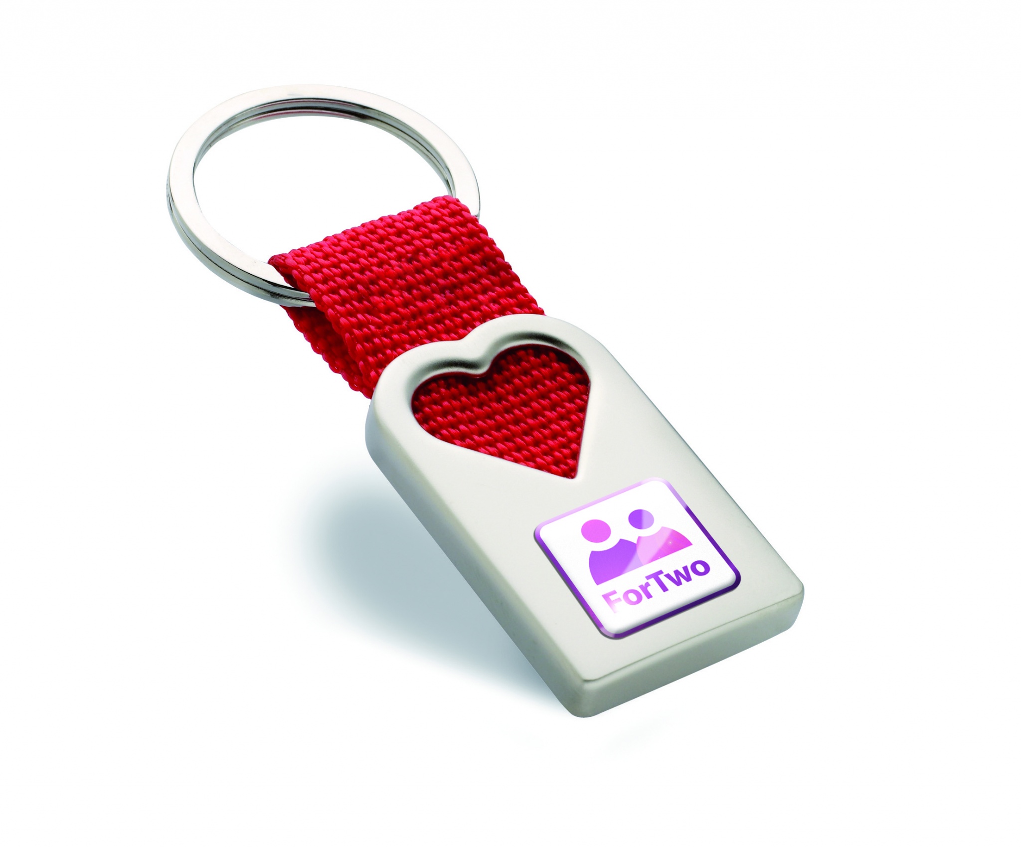 Metallinen avaimenperä sydämen muotoisella yksityiskohdalla, polyesterinauha metallirenkaalla. Sisältää lahjapakkauksen.