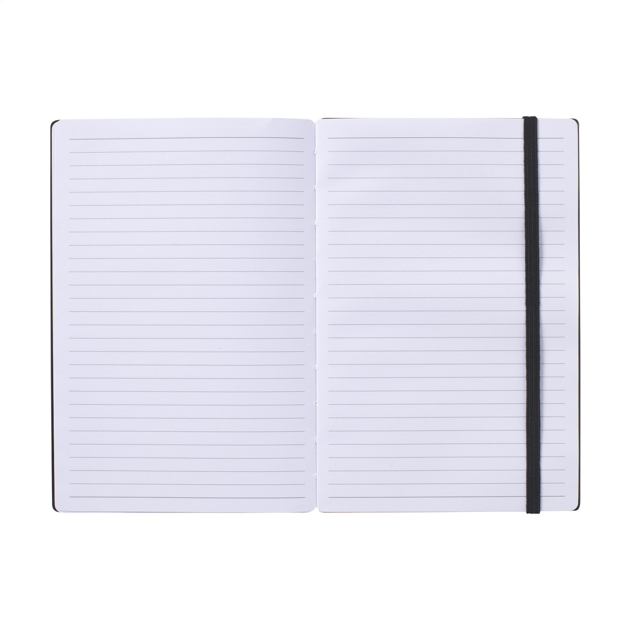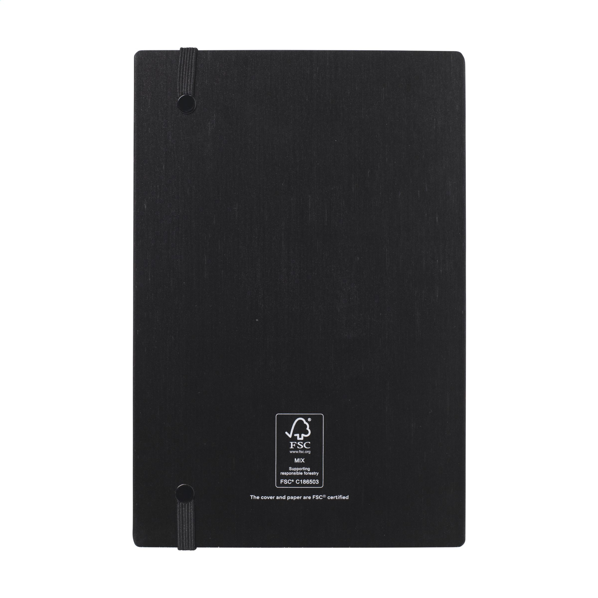 A5-kokoinen muistivihko tukevalla, mustaksi lakatulla FSC 100 % sertifioidulla bambukovakansiisella. Paljas selkäsidos. Tämä ominaisuus on suunniteltu erityisesti avaamaan kannettava tietokone mahdollisimman tasaisesti. Tämä tekee muistiinpanojen ja luonnosten tekemisestä paljon helpompaa. Joustava suljin ja n. 96 arkkia/192 sivua valkoista, vuorattua, FSC Mix -sertifioitua paperia.