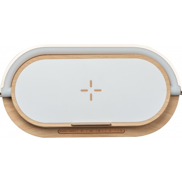 Bluetooth-kaiutin, jossa sisäänrakennettu induktiolaturi, digitaalinen näyttö, 2000 mAh akku, radio, herätyskello, puhelinteline ja lamppu kolmella kirkkaustasolla.