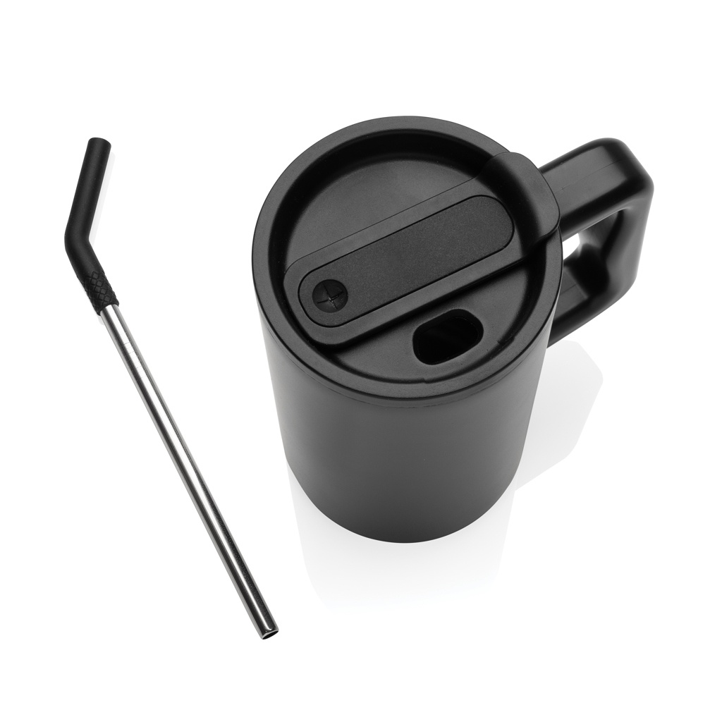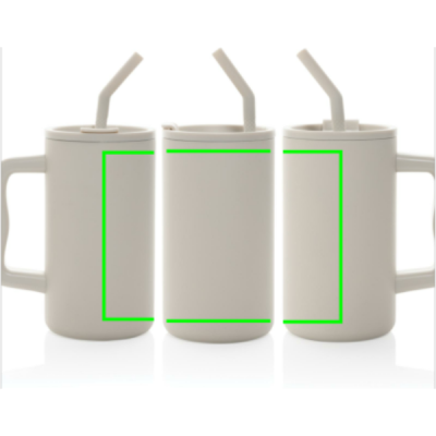 Hemmottele itseäsi reilunkokoisella 800 ml:n mukilla – tilava sekä täydellinen työpöydällesi. Sen tukeva kahva ja leveä pohja tekevät siitä ihanteellisen kumppanin päivittäiseen veden juomiseen toimistossa. Tämä kestävästä kierrätetystä ruostumattomasta teräksestä valmistettu muki on suunniteltu täyttämään nesteytystarpeesi. Tämä iso, kaksiseinäinen, tyhjiöeristetty muki on varustettu turvallisella kannella, pillillä ja silikonikärjellä. Riittävän monipuolinen sekä kuumille että jääkylmille juomille; lisäksi sen kierrettävä kansi tarjoaa kaksinkertaisen toiminnon – kätevän juomasuuttimen tai mahdollisuuden käyttää pilliä. Parhaan ylläpidon varmistamiseksi suosittelemme käsinpesua.