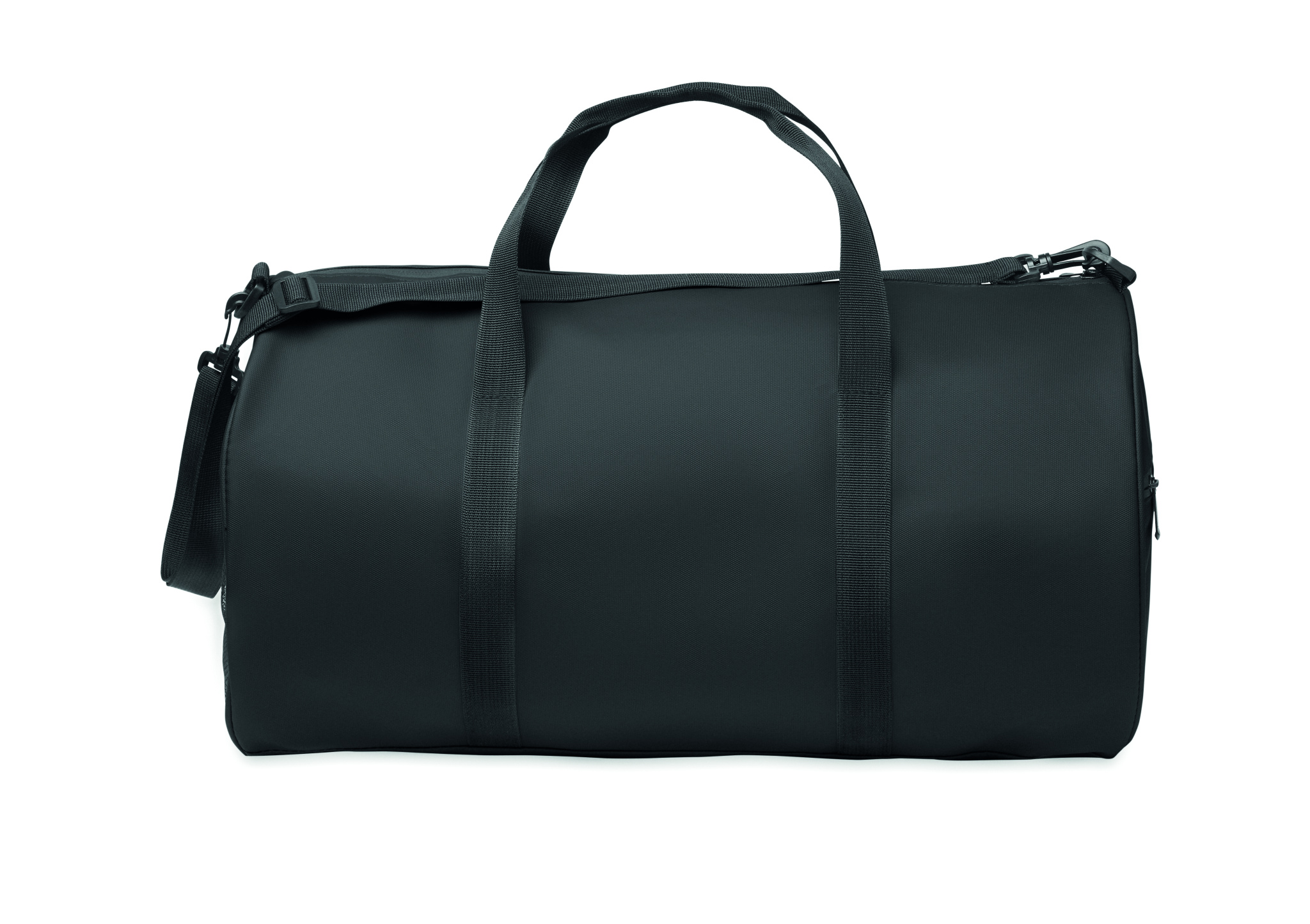 Duffelilaukku 600D RPET -polyesteriä PU-pinnoitteella. Vetoketjullinen etutasku. Sisällä 210D RPET -polyesterivuori. Yksi vetoketjullinen sivutasku / yksi sivuverkkotasku. Vetoketjullinen sisätasku.
