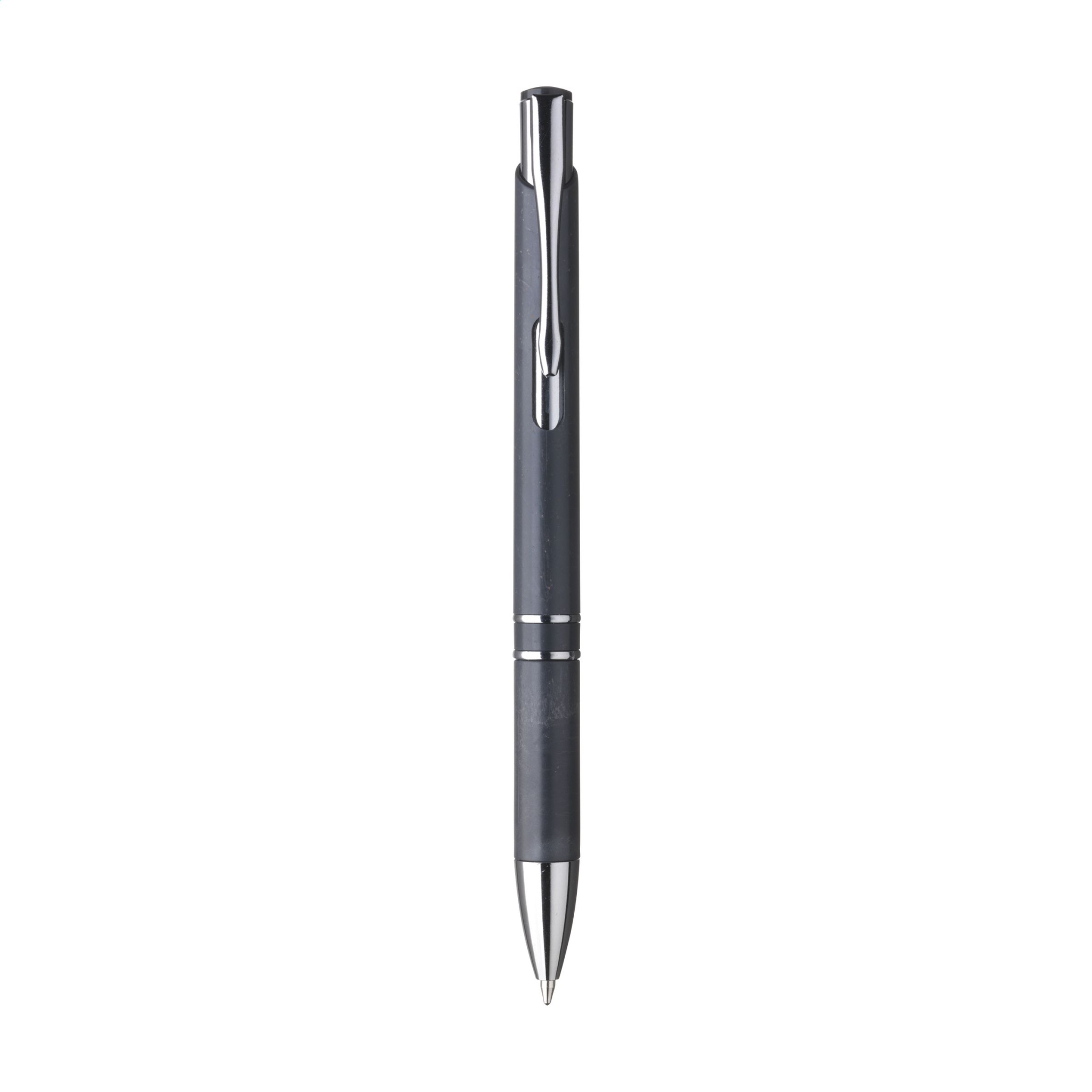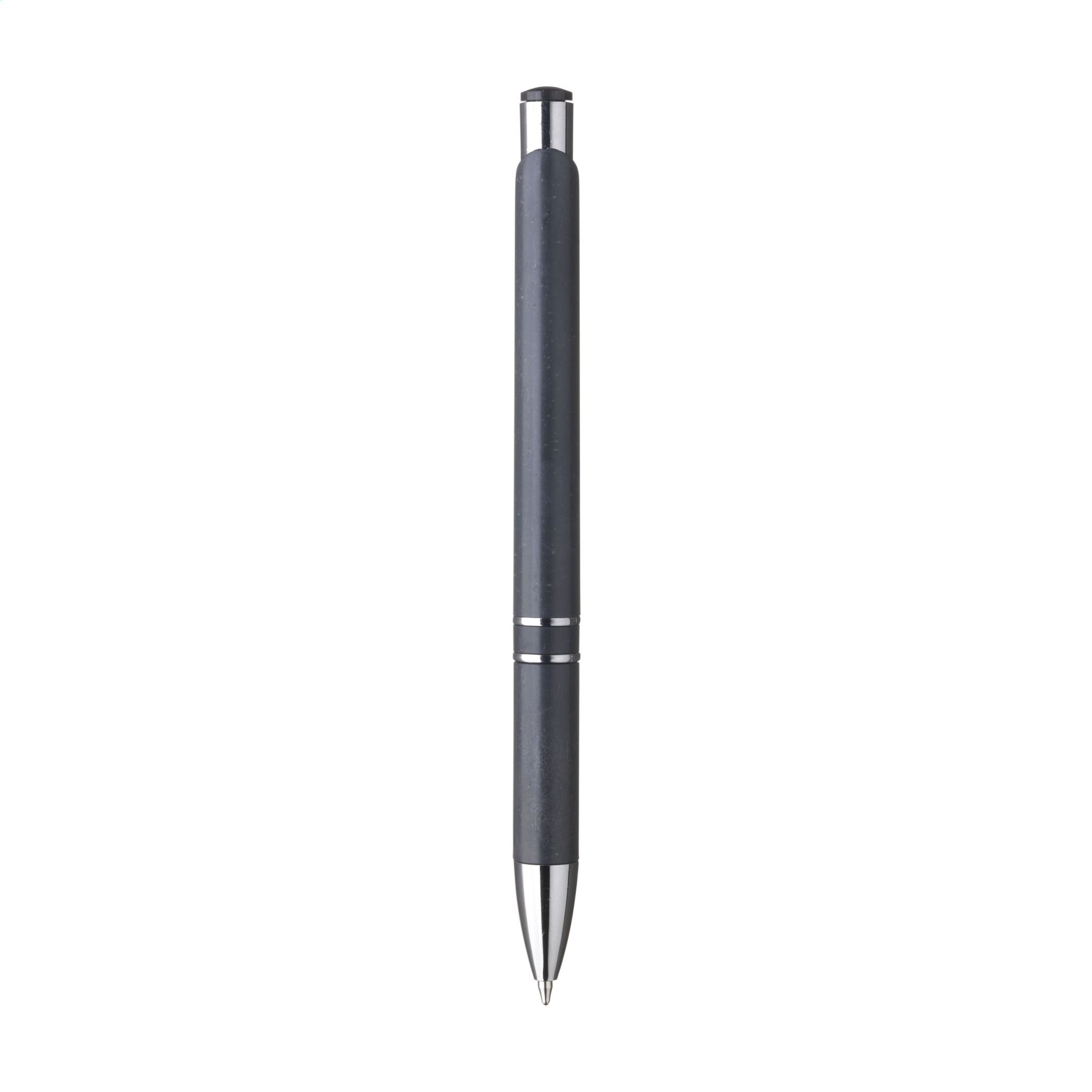 Sinisellä musteella varustettu kuulakärkikynä, jonka piippu on valmistettu 50 % ABS:stä ja 50 % vehnän oljesta, metalliklipsi ja muoviset kromikoristeet.