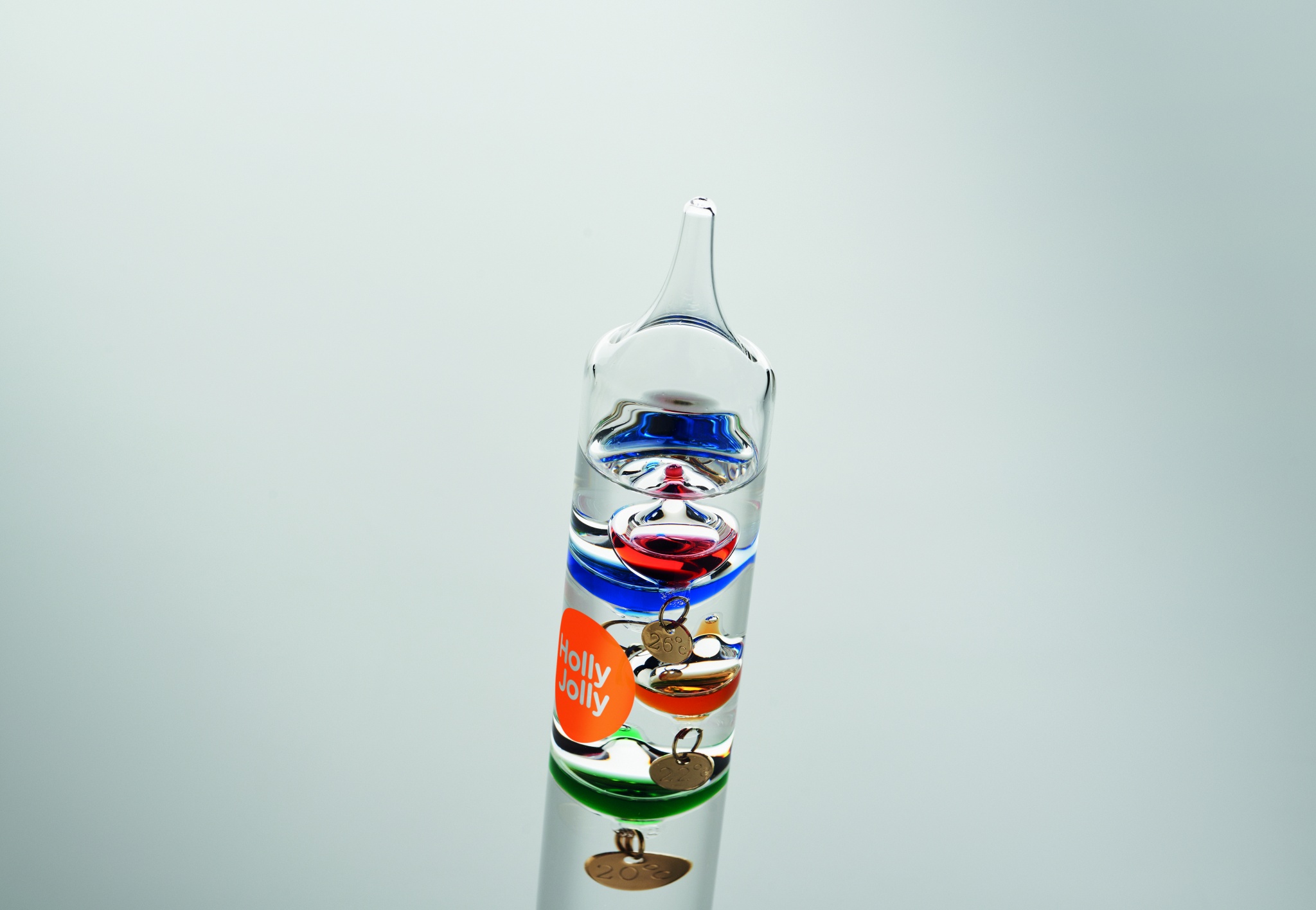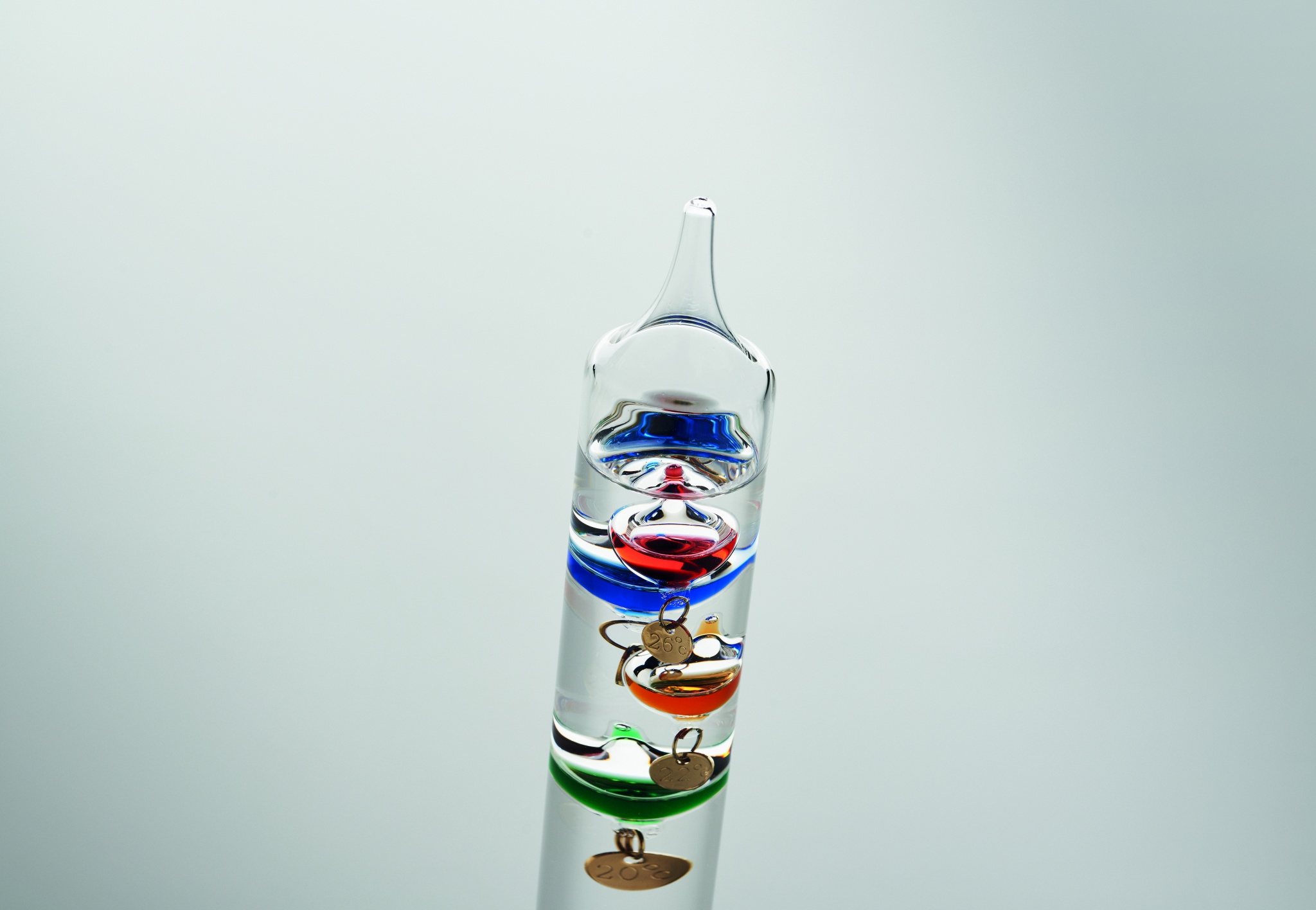 Lasinen Galileo-lämpömittari, jossa on viisi värillistä kelluvaa palloa. Kukin pallo osoittaa lämpötilan 18 °C:sta 26 °C:een: Punainen 26°, royalsininen 24°, oranssi 22°, vihreä 20° ja violetti - 18°. Ylimmän ryhmän alin pallo osoittaa ympäristön lämpötilan.